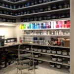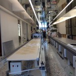 So we headed downstairs to the main floor where they hand silk-screen the wallpaper. Three guys were printing and they have the process down to a science. The long table sucks the paper down with air while the screen gets placed over the paper and then two guys hand squeegy the ink, move to the next spot and so on. You can choose any color for your paper as they work from the screens, just endless possibilities.