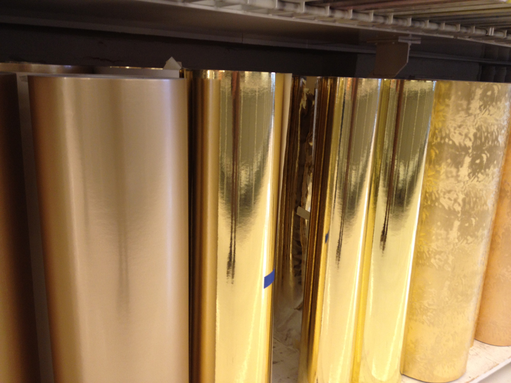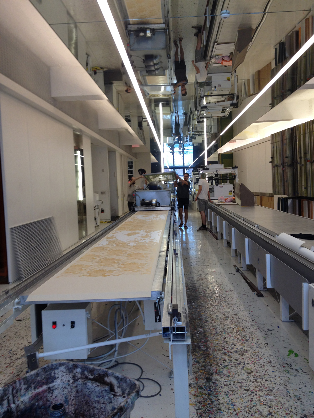 So we headed downstairs to the main floor where they hand silk-screen the wallpaper. Three guys were printing and they have the process down to a science. The long table sucks the paper down with air while the screen gets placed over the paper and then two guys hand squeegy the ink, move to the next spot and so on. You can choose any color for your paper as they work from the screens, just endless possibilities.