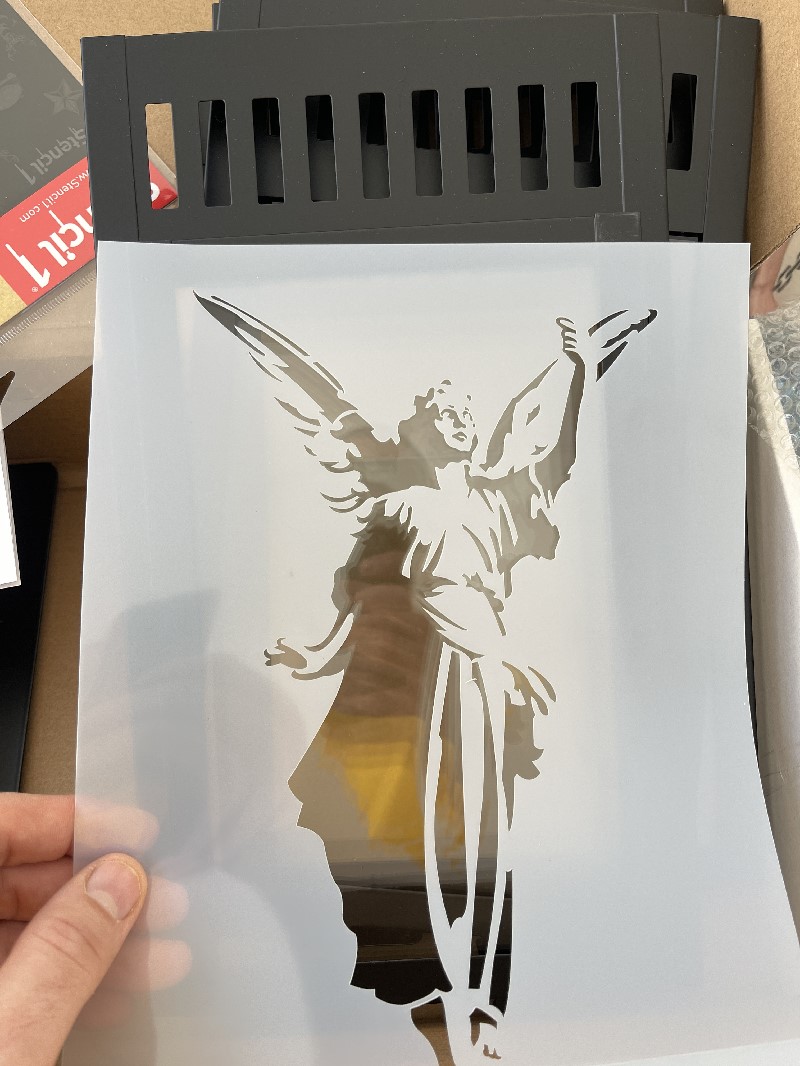 This decor was thought out to be symmetrical and luckily with stencils you can flip them to do mirror images! I choose our Angel stencil in 8.5” x 11” but you can do whatever images you want for any season or just for decor.