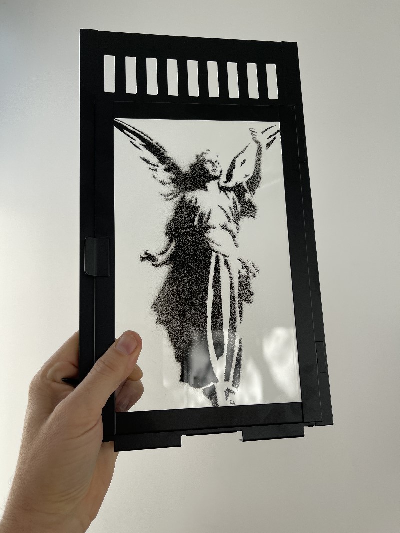 I did the same for the second lantern glass except flipped the stencil so the angels face each other when placed on each side of the entry. When planning this, make sure you are stenciling the inside of the glass so it stays protected from the elements.