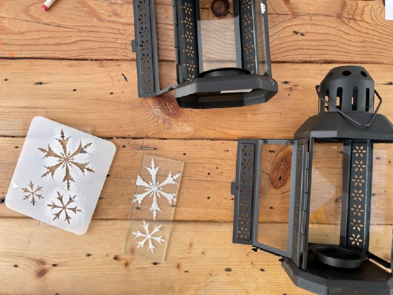 I hand brush painted the smaller lanterns with our snowflake stencil. Balanced and tasteful, no?
