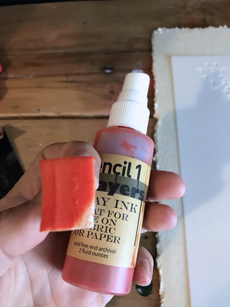With the Stencil1 Sprayer of your choice, spray the bottom, more dense end, of the cosmetic sponge. Using a cosmetic sponge works perfectly with spray inks because it gives you more control than a brush, but still helps maintain the translucent quality of the ink.