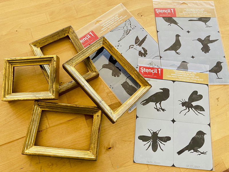 Customize a montage of frames to suit your décor with Stencil1 art. Breathe new life into old frames by stenciling glitter on felt!