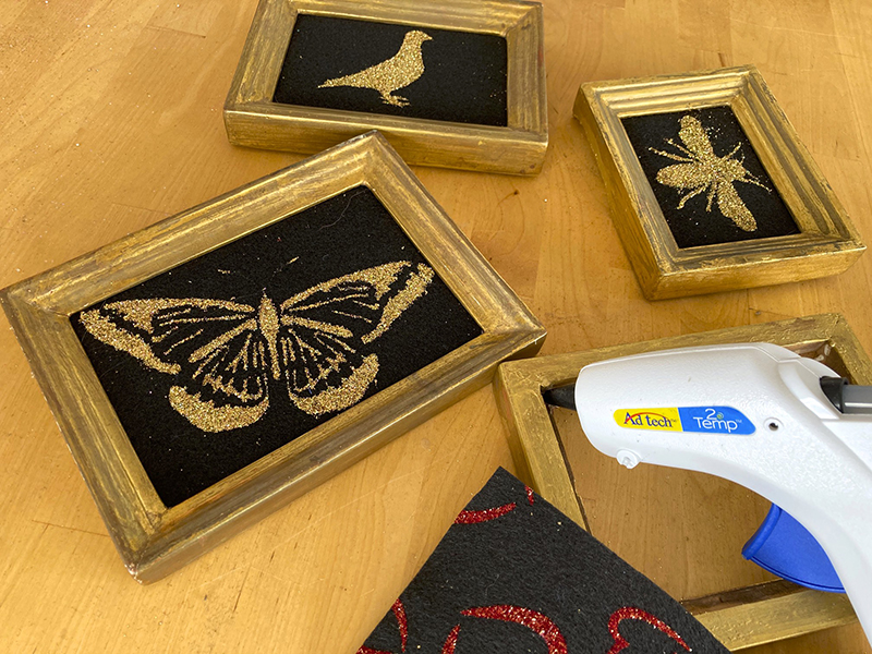 Now you are ready to mount the glitter prints into the frames. Apply a dab of hot glue in the corners of the frames and position the felt so that the artwork is centered.