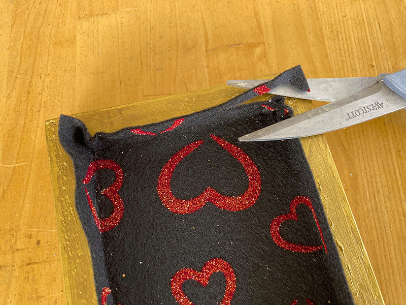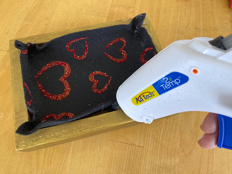 Then secure the sides with more hot glue, stretching it tight. (Ignore that old heart design from an old project!).