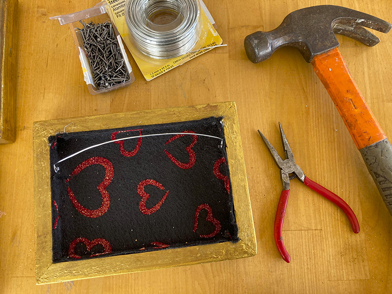 If your frame requires a wire, simply hammer two brads into the sides. Then use pliers to fashion a wire to hook around the brads.