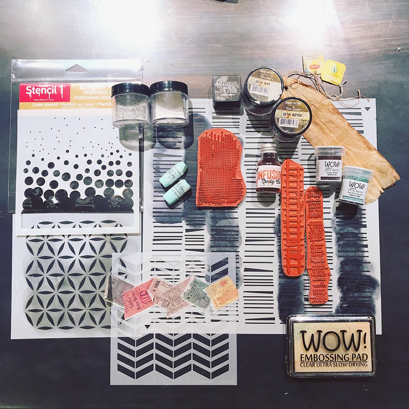 Black Archival ink through Stencil1 small Moroccan stencil was the next layer. Molding paste through Stencil1 Bubbles Up stencil followed and I painted around the bubbles with PaperArtsy Infusions in color, Rusty Car to highlight. Some stamps from SethApter were used around the edges and on collage elements (#3180-LG Mark Makers and Tracks) in both coffee Archival Ink and Baked Texture Embossing Powders (White Cloud, Taos Sunset, Dusk, Blizzard, and Eclipse). A final Stencil1 stencil finished off the left side by embossing White Cloud Baked Texture through The Small Chevron Stencil leading your eye to a vintage typewritten quote. Collage embossed numbers abided a vertical element and were attached with small white brads.