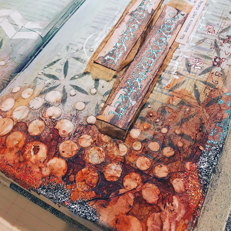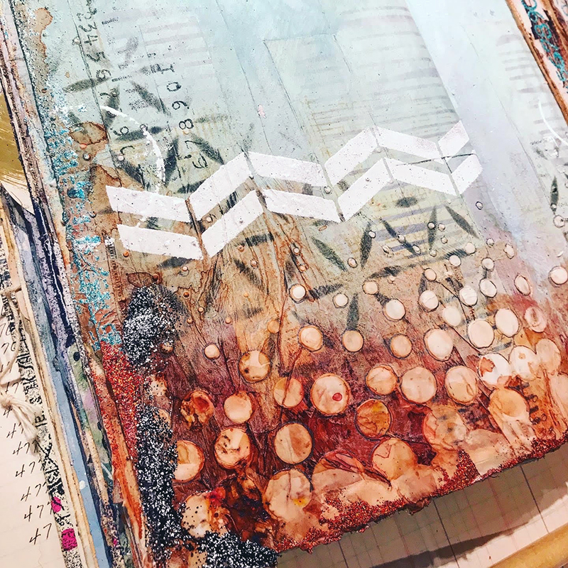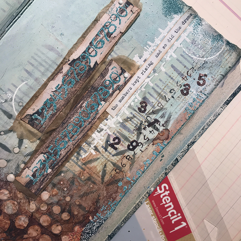 “The numbers kept rising and so did the drama” I collaged vintage ledger paper columns onto altered book pages with a glue stick. The pattern of the papers lent themselves beautifully to the Stencil1 Thatched Texture stencil which I stamped through using archival black ink so it didn’t smudge. I wanted to see hints of this but wanted it to be more in the background for the layers that followed so I used pastel and a combination of clear and white gesso to color but still provide some transparency.