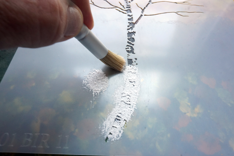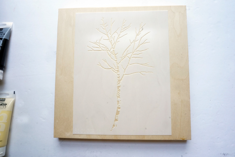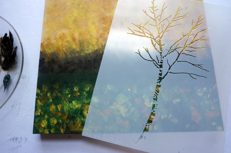 Here’s the trick. We want a white birch with black marking so first stencil in the tree in black or very dark brown or gray.