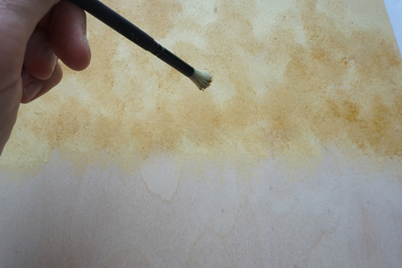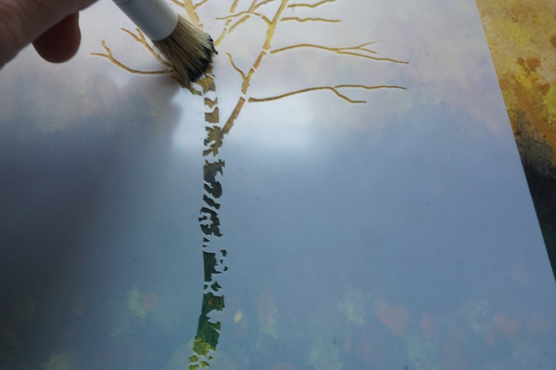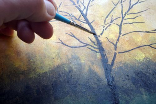 The tree is stenciled in dark but that is basically a guide for you to go in and paint in the details and bridges to create the under-layer of the tree.
