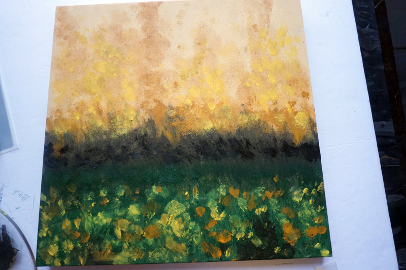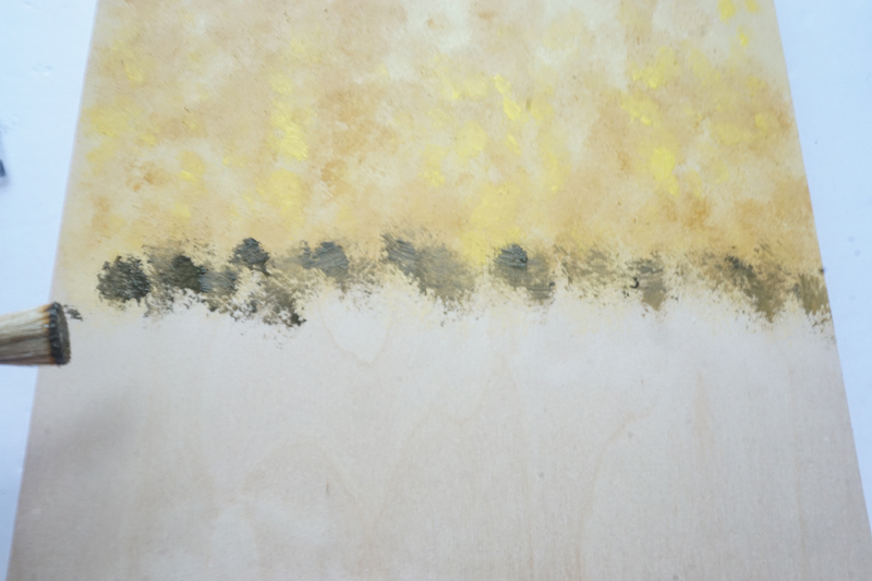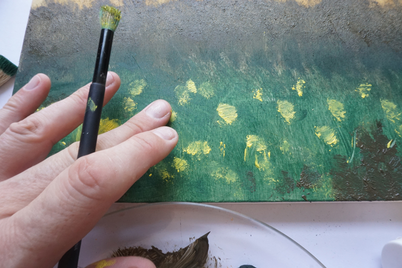 I want all the leaves and ground to have a very varied texture, you don’t wan to see the same brush stroke over and over. Turn the brush in different directions as well as use your fingers if you want to get a unique stroke on the canvas.
