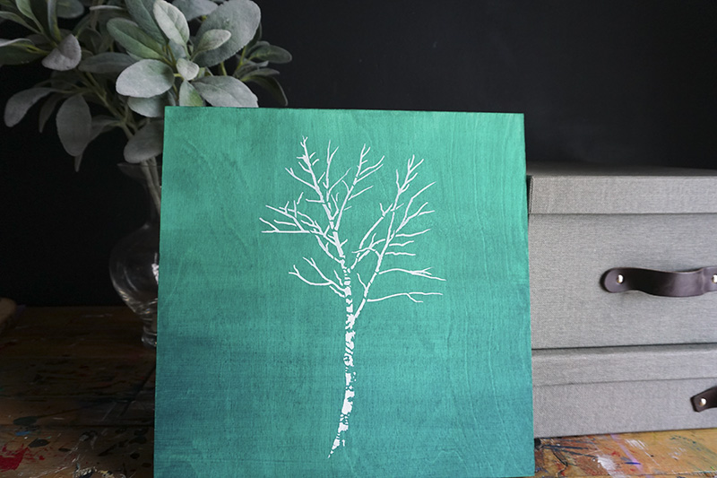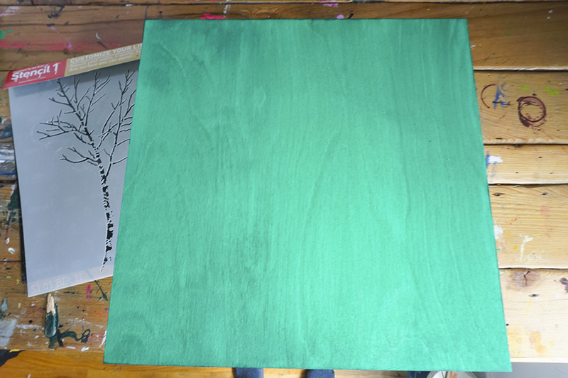 Once it is dry, get your birch tree stencil and center it on the board.