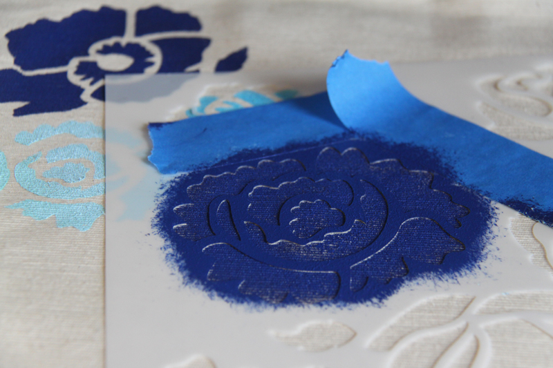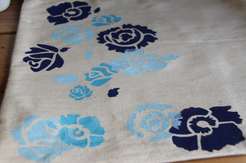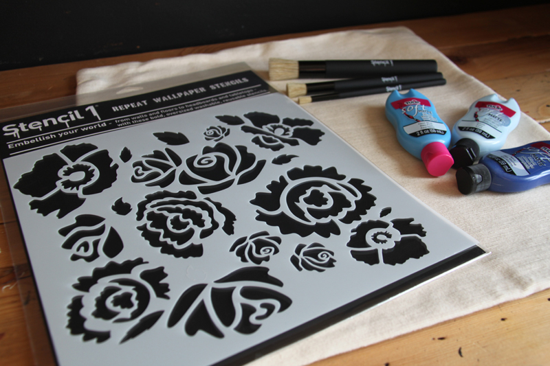 This is what you’ll need to make this pillow-case: Stencil1 Bouquet Stencil, Tulip Soft Paint (we used matte finish and three different tones of blue), stencil brushes, painter’s tape, a cardboard insert, and a pillowcase.