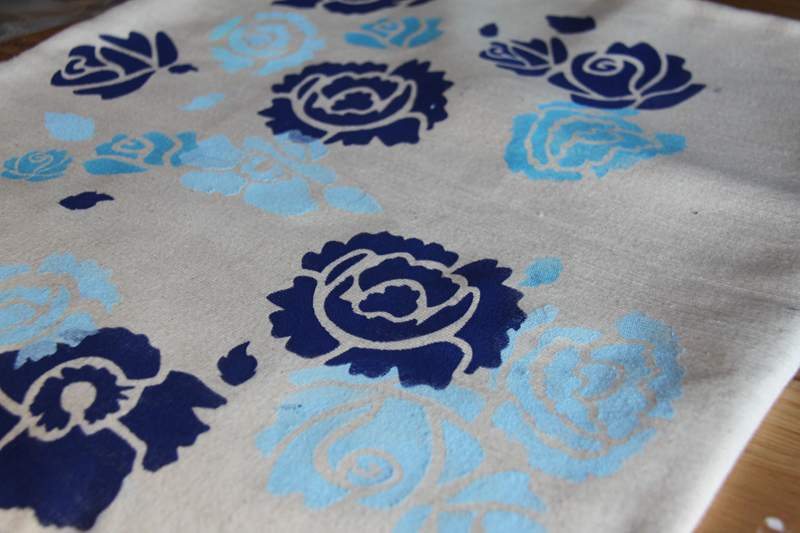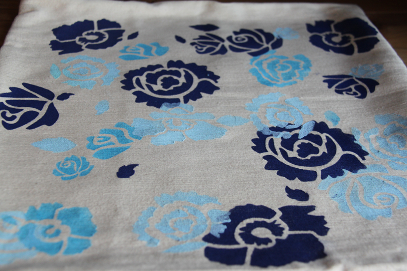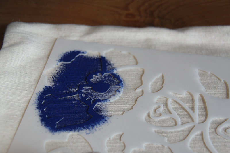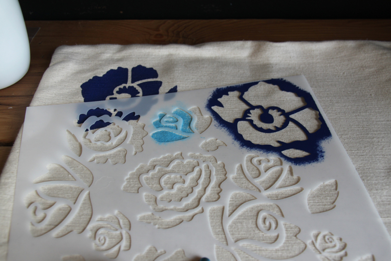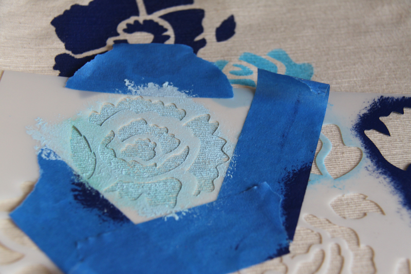 Step 3: Once the paint has dried to touch, move on to your next flower! We used painter’s tape to cover up parts of the pillow we did not want to stencil.