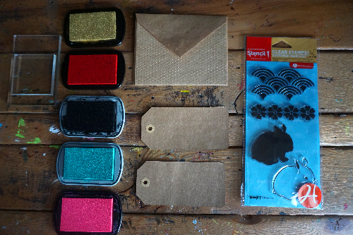 You will need a blank card set and gift tags, a Stencil1 Stamp Set, and a variety of ink pads in different colors.