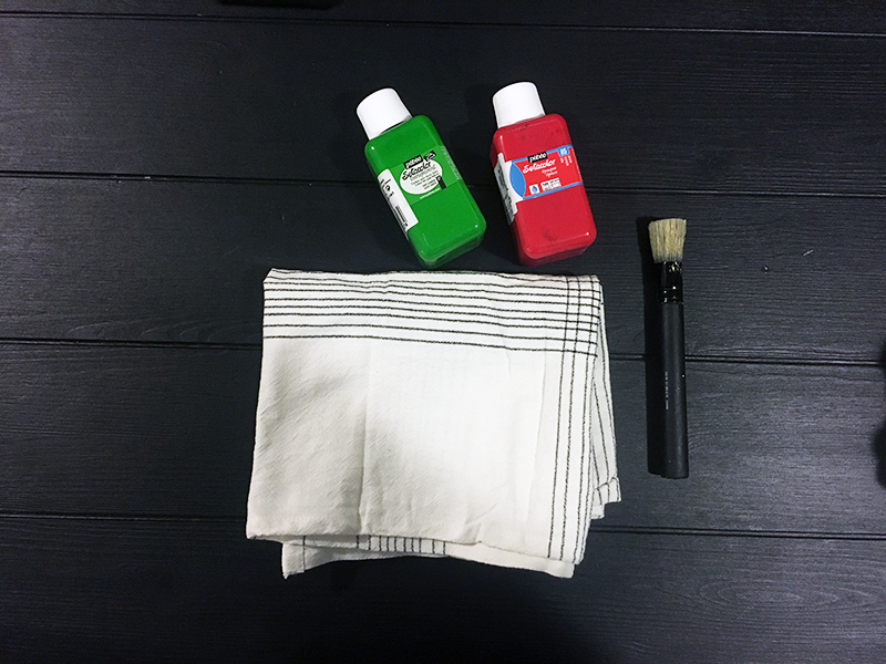 Grab the tools you will need, including the kitchen towel you want to paint, brushes, and red and green paint.