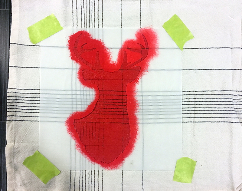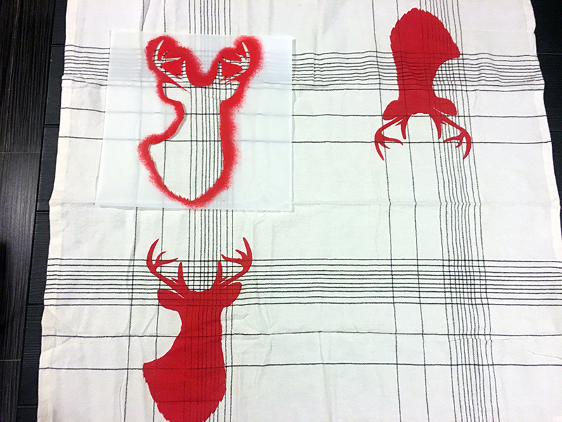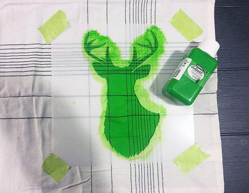 After painting the red deer on the left bottom corner, I began to get ready to paint the green deers. I cleaned the stencil before starting to use green paint.