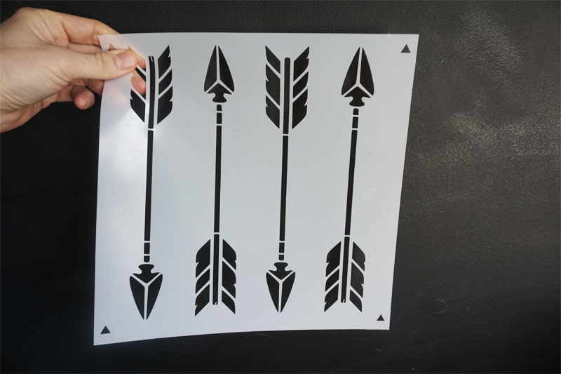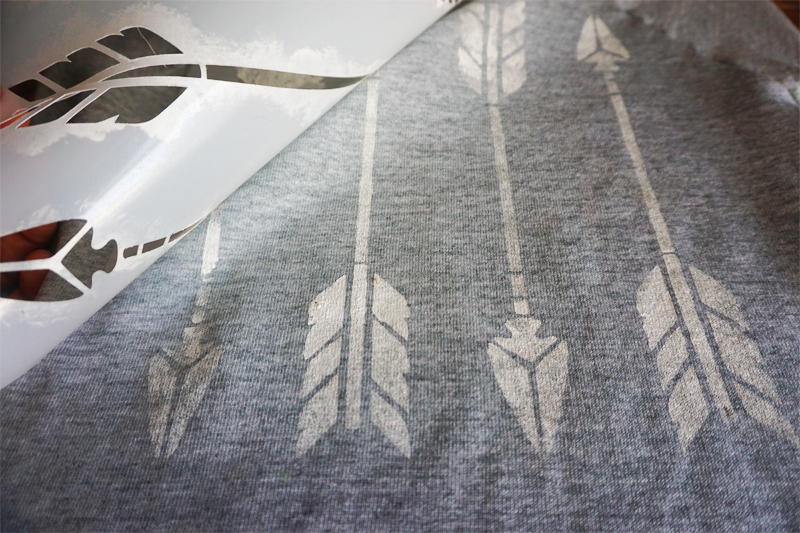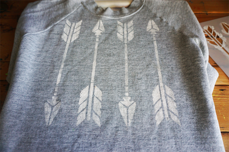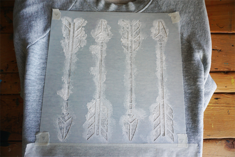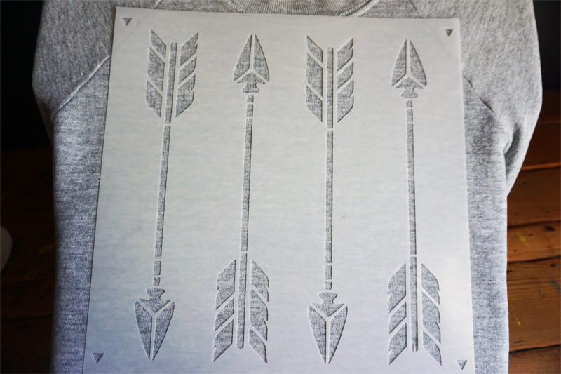 Step 2: Determine where you want to place the Arrows stencil on the sweater. Once you decide the placement, apply your low-tack spray adhesive to the back on the stencil. Once tacky, place onto sweater. Put masking tape on the edges to prevent painting outside the stencil.