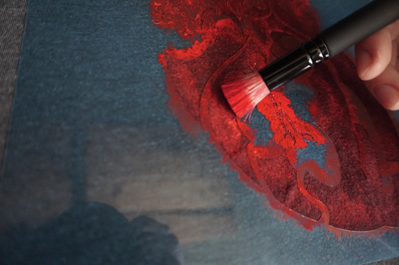 Step 3: Now it’s time to paint. Using a clean, dry stencil brush, begin stippling the paint over the stencil. Depending on what finish you want, you can either apply an opaque layer for a crisp look, or a light layer to create more of a distressed effect. We used Jacquard paint in this DIY.