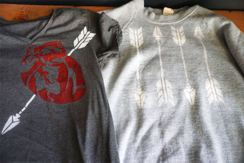 Things you will need: 1 T-shirt or sweater of your choice, fabric paint, low tack spray adhesive, Arrows stencil, Heart stencil, tape, brushes, and cardboard.