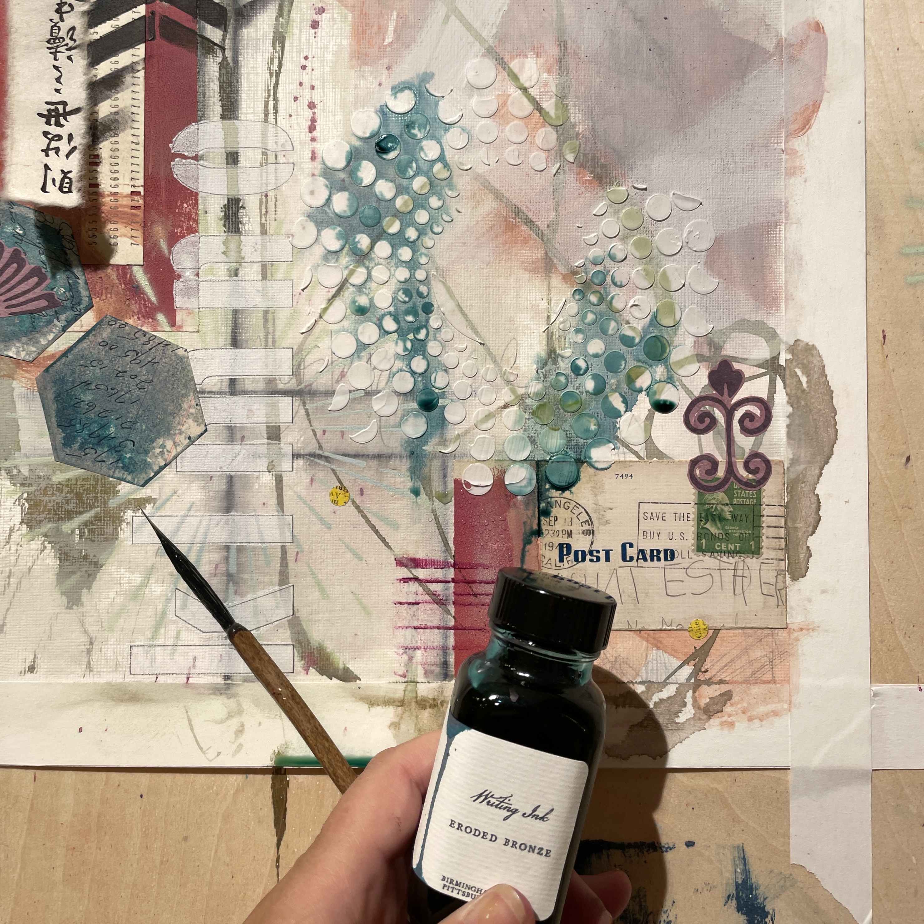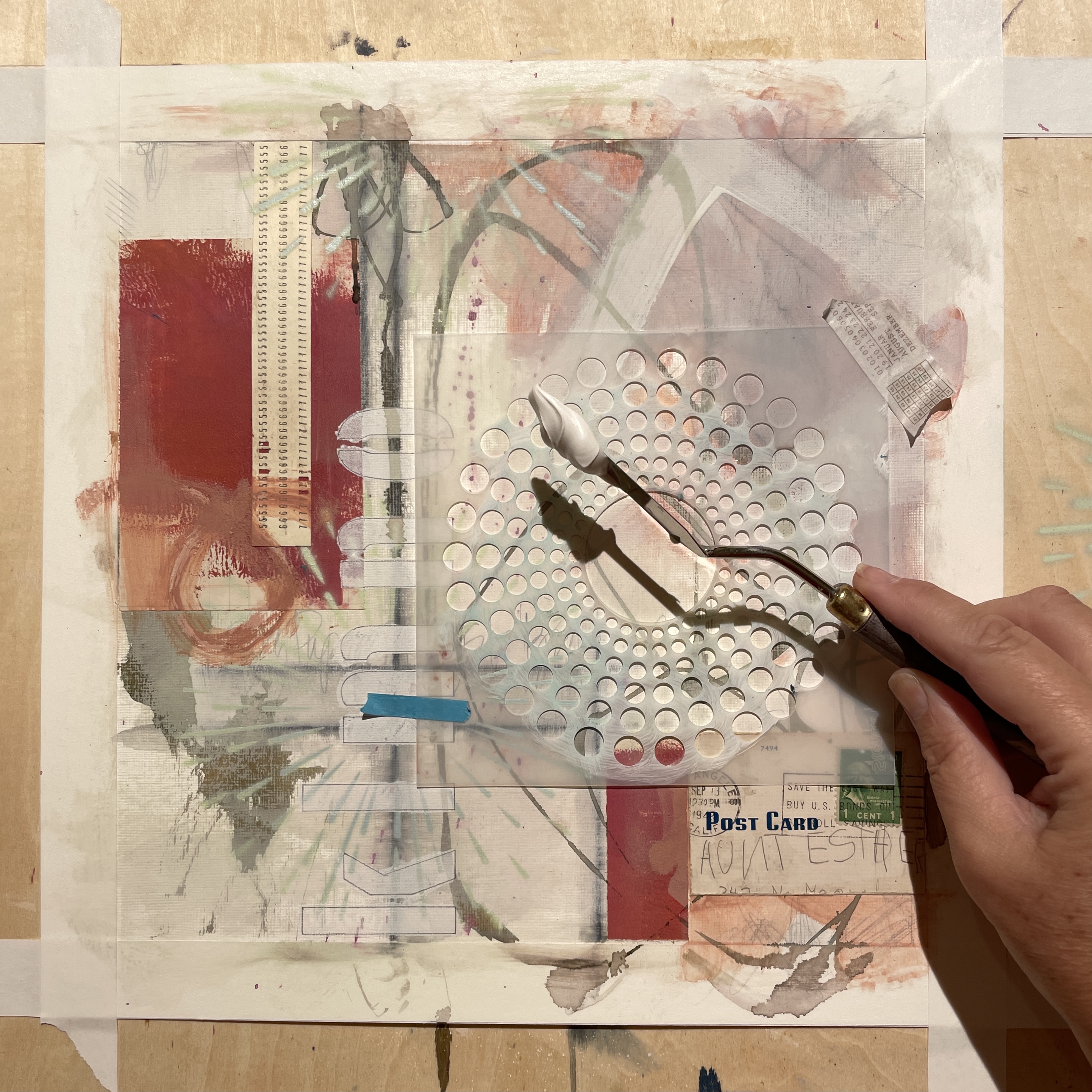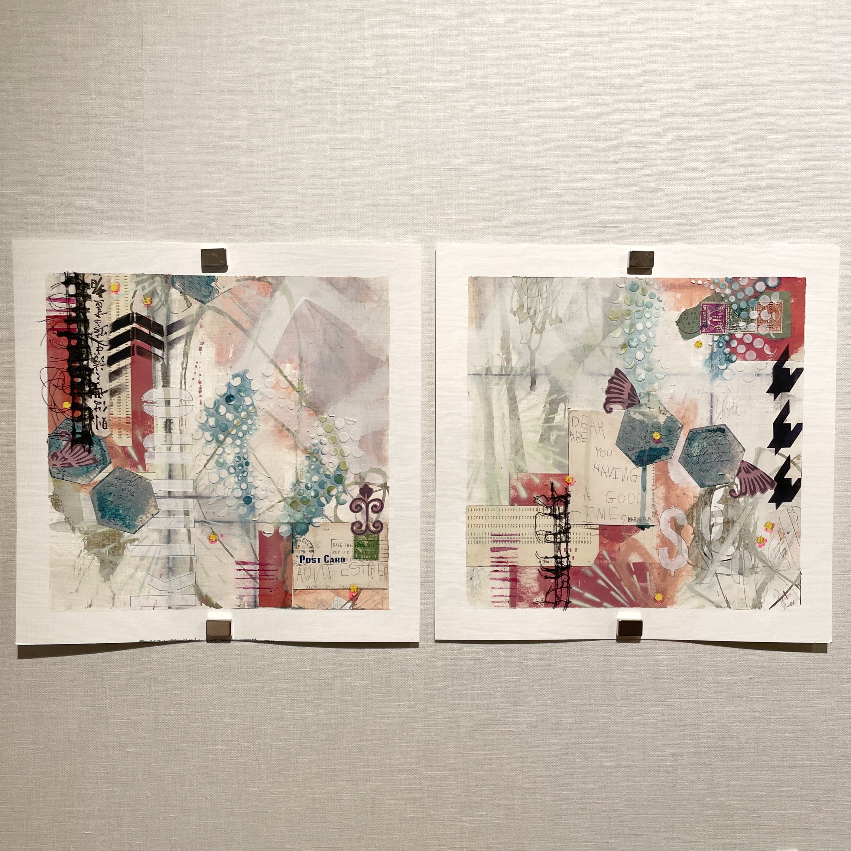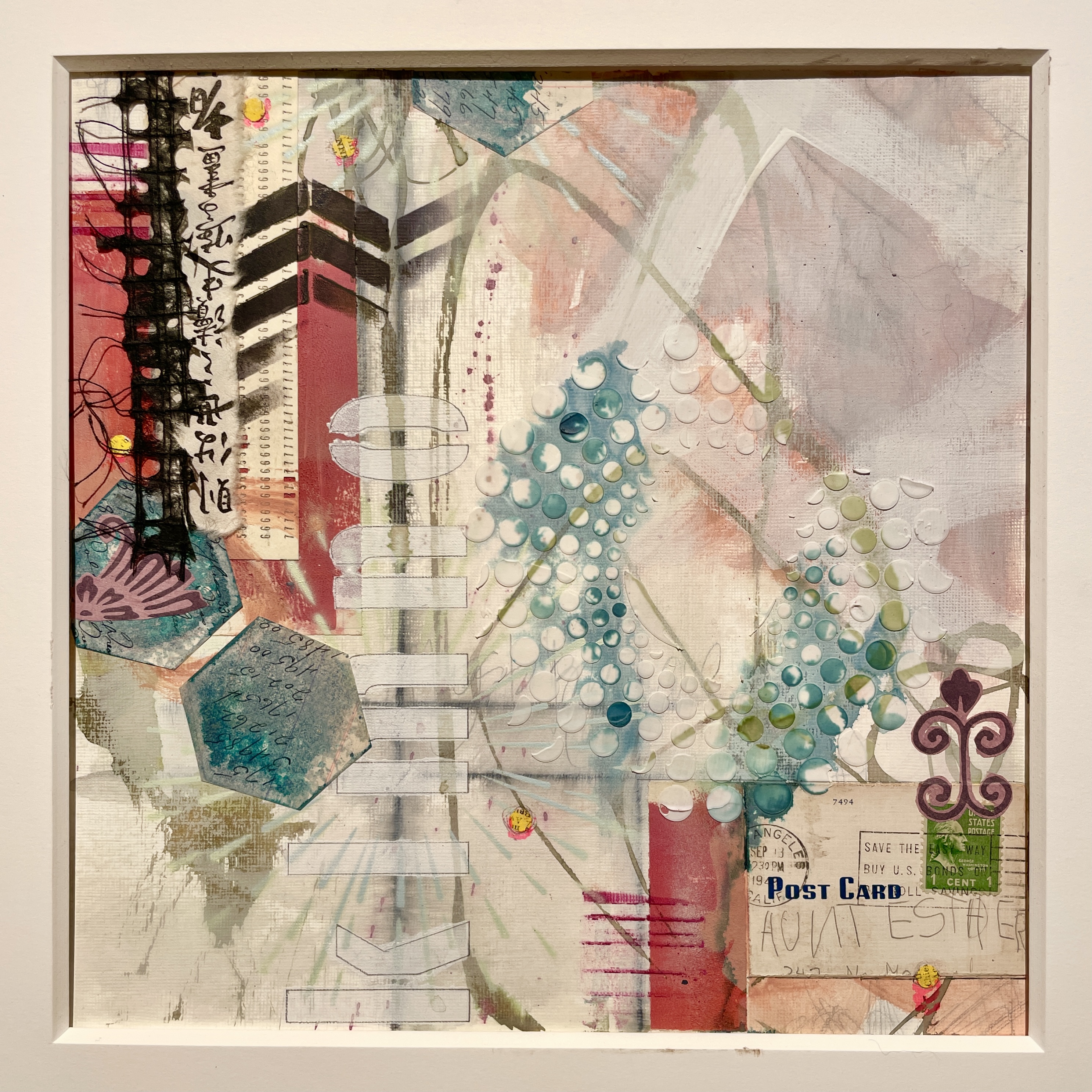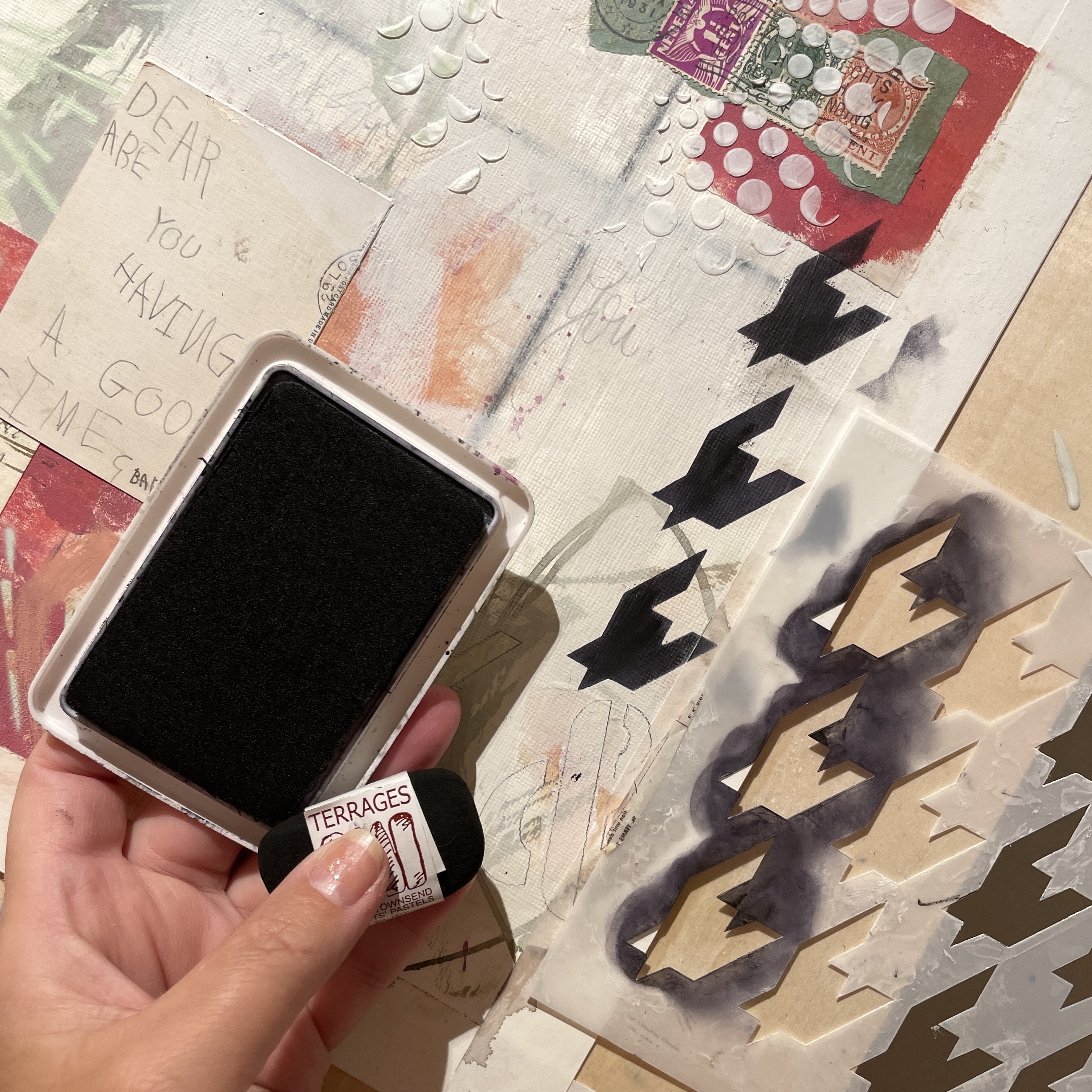 I loved using these stencils with that vintage postcard, “Dear Aunt Esther, Are you having a good time?” Hope you are inspired to make some mixed media works on paper yourself!