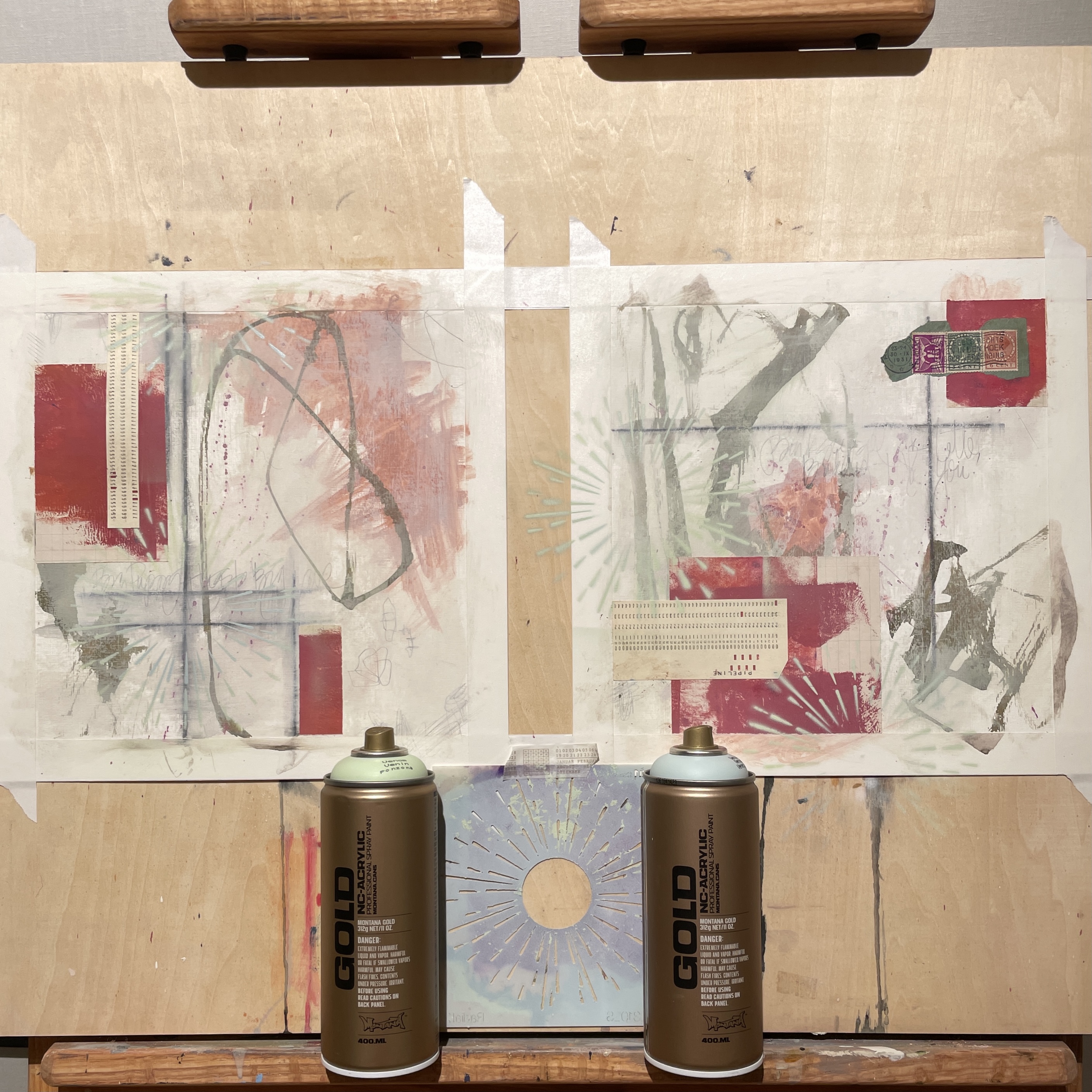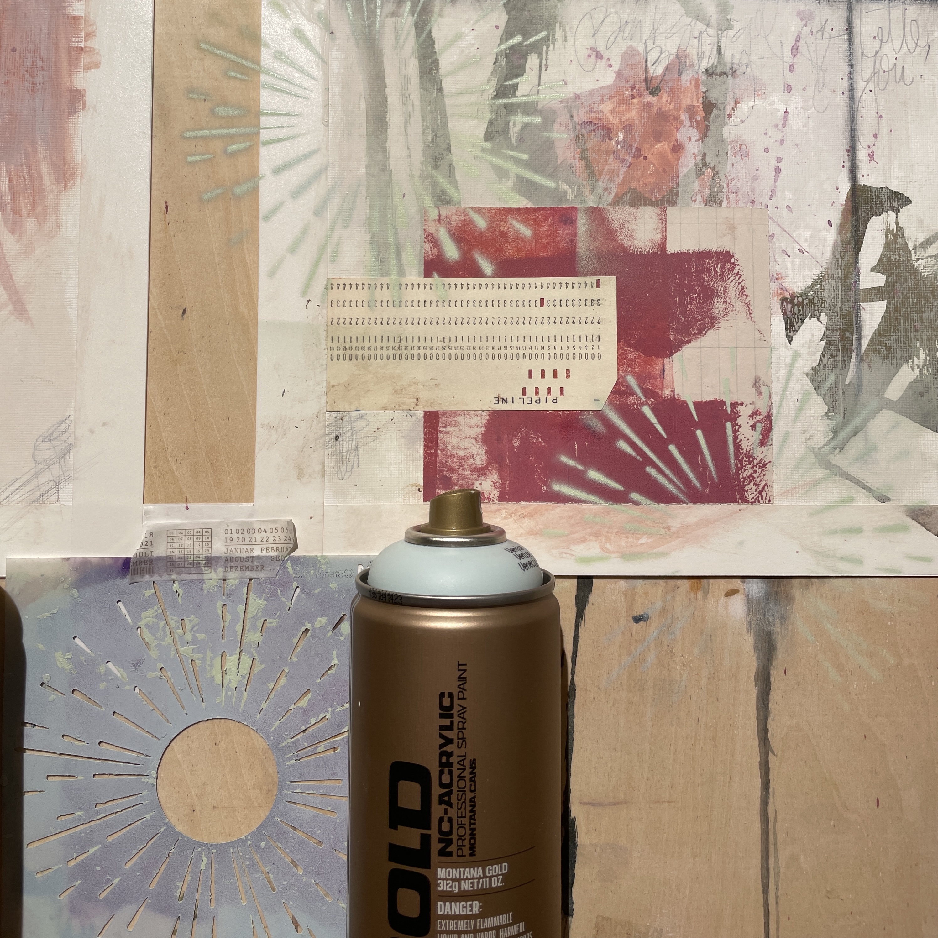 Using the Radial 2 Stencil, spray paint some colors through the stencil over the collage and backgrounds to marry the elements. (cover around the stencil with paper towel or scrap papers to avoid overspray)…