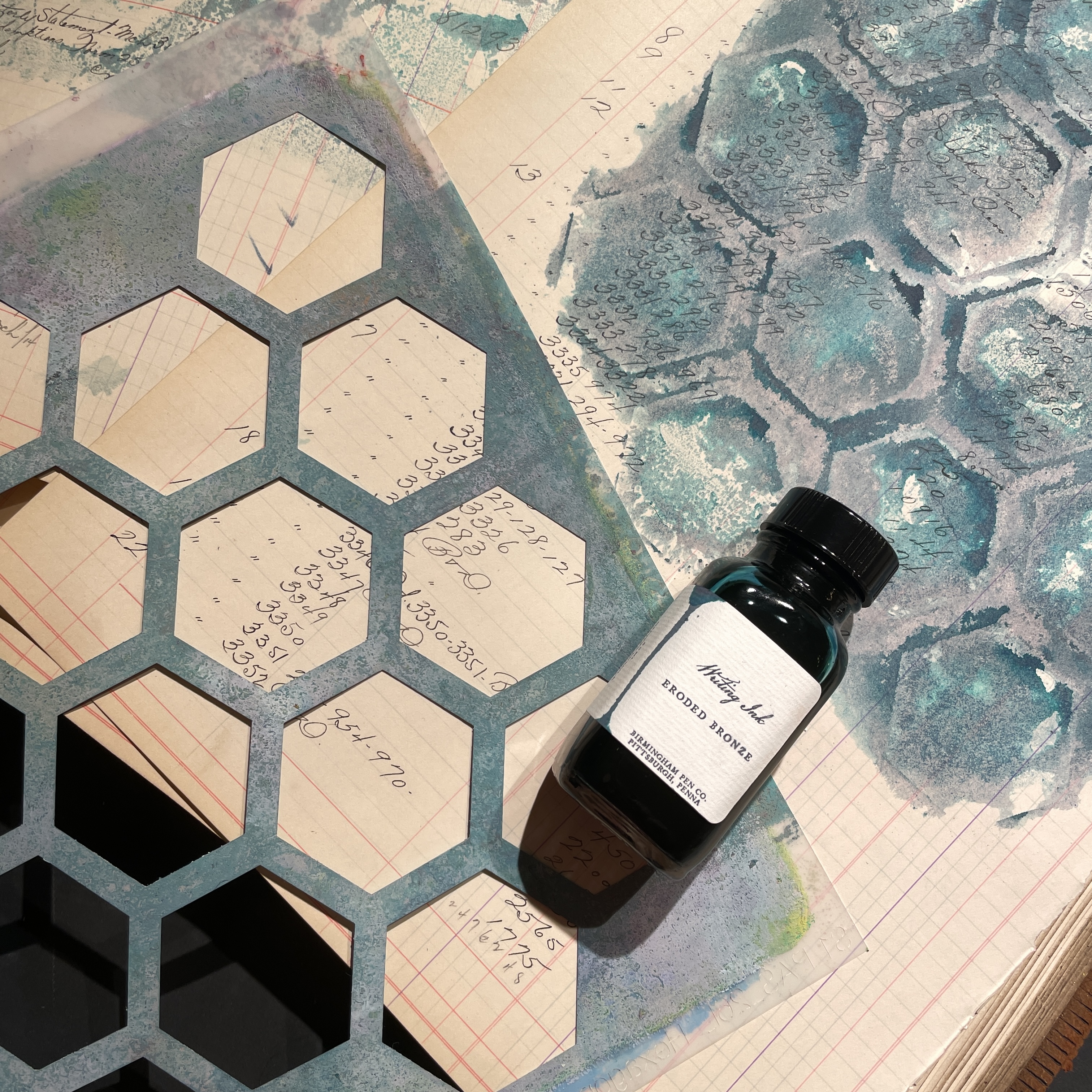 The final touches consisted of adding some eroded bronze ink with a paint brush through the radial pattern and modeling paste, spritzing with water until you like the coloring.  I added some cut hexagons using the Hexagons Stencil, Ink and a Gelli Plate and glued the hex’s in several spots on both papers.
