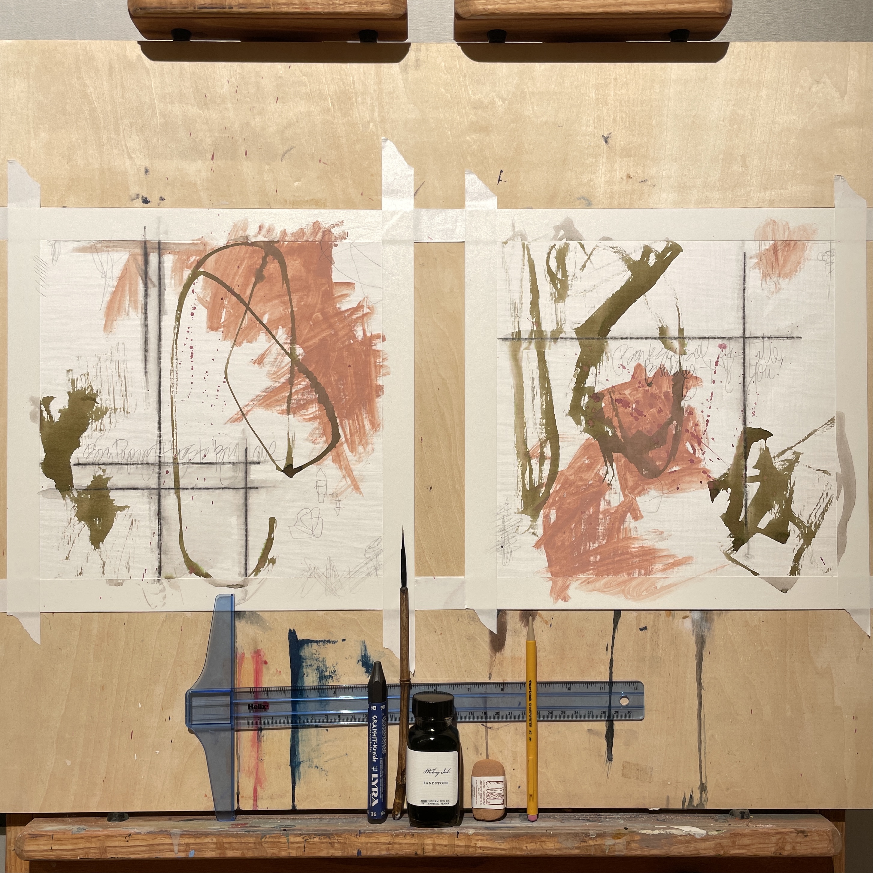 Place several horizontal and vertical lines with a T Square and Lyra Graphite Pencil to start establishing a pattern and breaking your white page.  Run a damp paintbrush over the lines to soften.  Using a water soluble peach pastel, scribble some shapes onto your pages.  Dampen with water or clear gesso.  Add some sweeping marks with a paintbrush and sandstone ink. Using a pencil, add some random messy script.