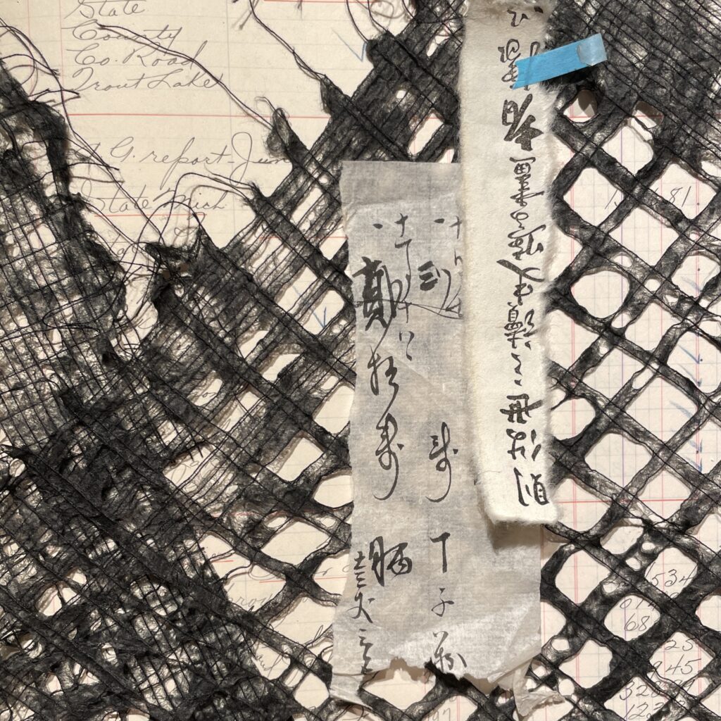Attach some vertical texture and pattern with some vintage calligraphy and handmade open weave black fiber paper.