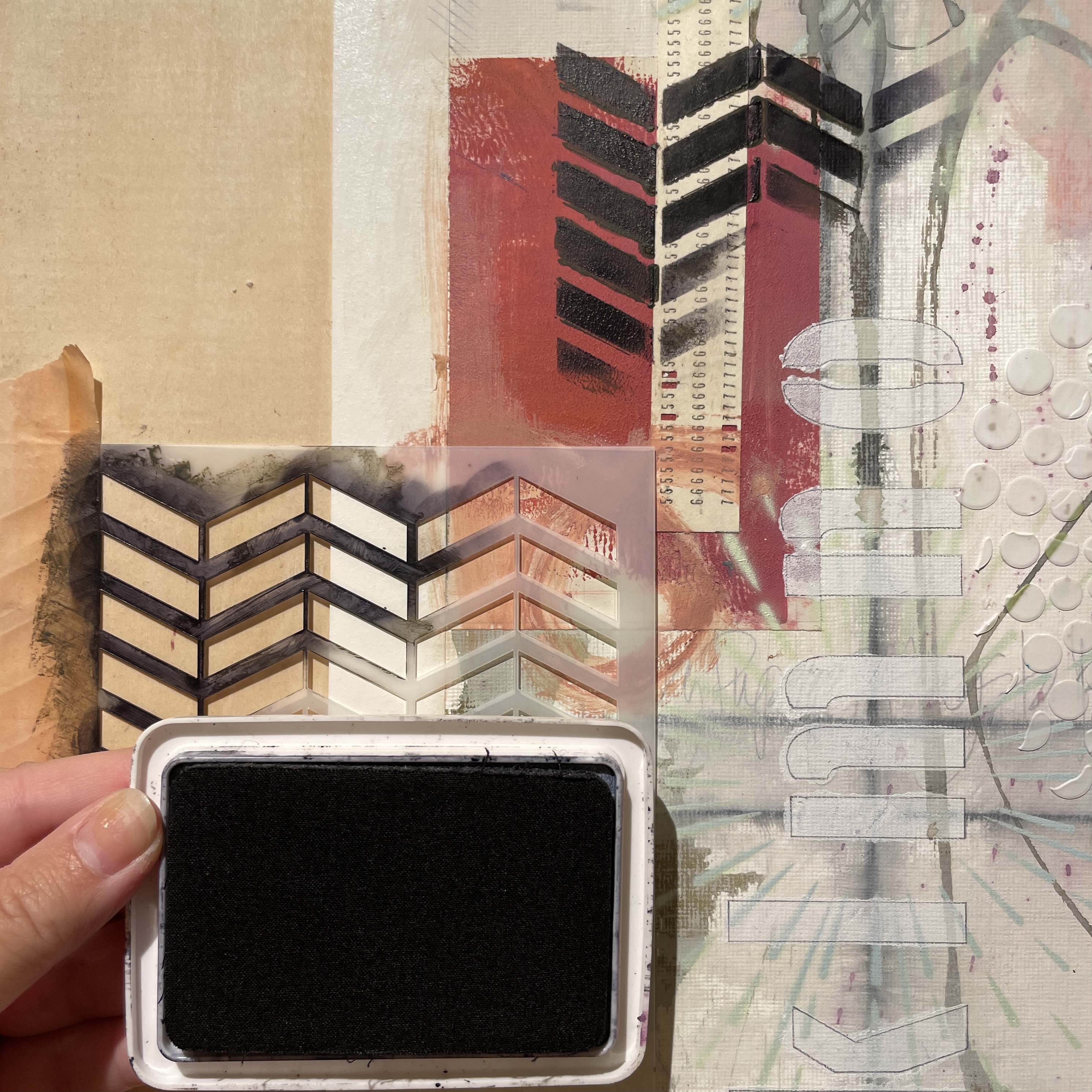 Almost there! The next layer consists of a fuchsia soft pastel being placed onto the Thatched Texture Stencil and scribbled through with some help from your finger ;), again connecting some of the collage and overlapping elements.