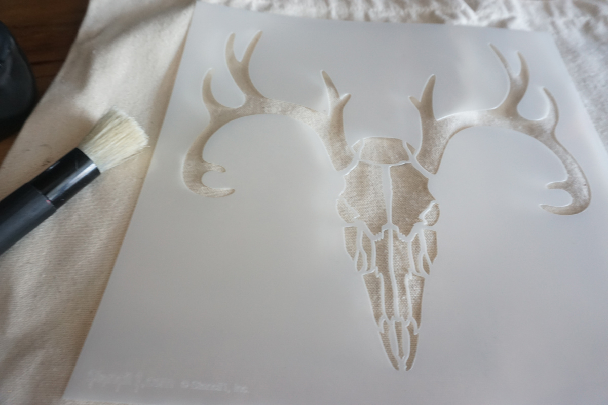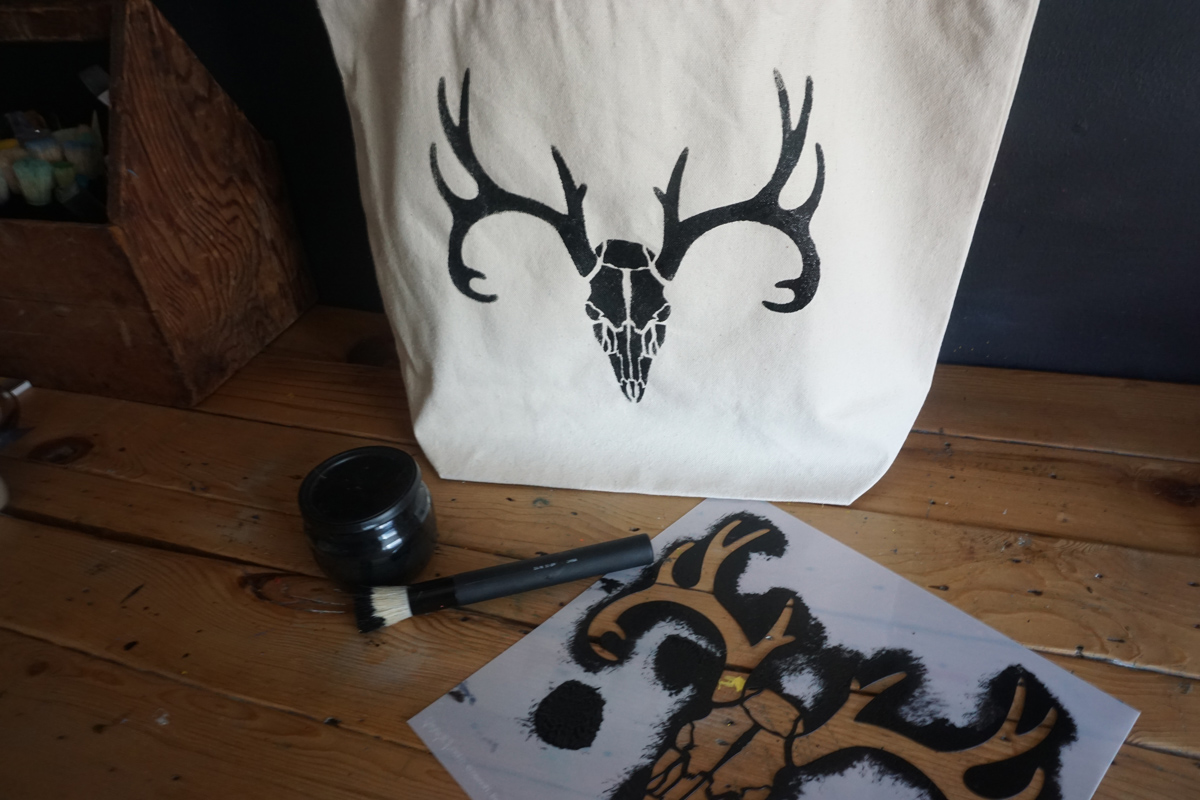 Place your stencil in your desired location of the tote. Here we’re using the Stencil1 Deer Skull stencil.