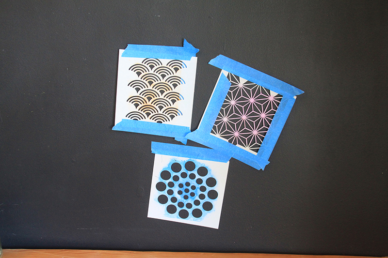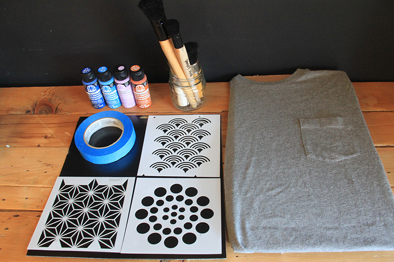 This is what you will need for this how to: Stencil1 Scallop, Star, and Asian Dots pattern stencils, multi-purpose paint, stencil brushes, painters tape, pocket T, cardboard insert, low-tack spray adhesive.