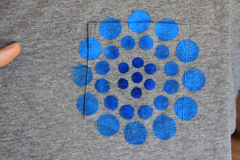 Step 8: Repeat steps 1 through 7 but with the other pattern stencils. Try playing around with some fun color combinations. We paired a blue shirt with a purple paint, and gray with blue.