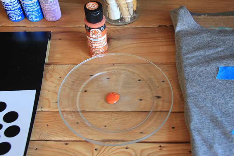 Step 4: Put some paint on your plate, or any other hard surface. For this stencil we used a gray t-shirt and orange fabric paint.