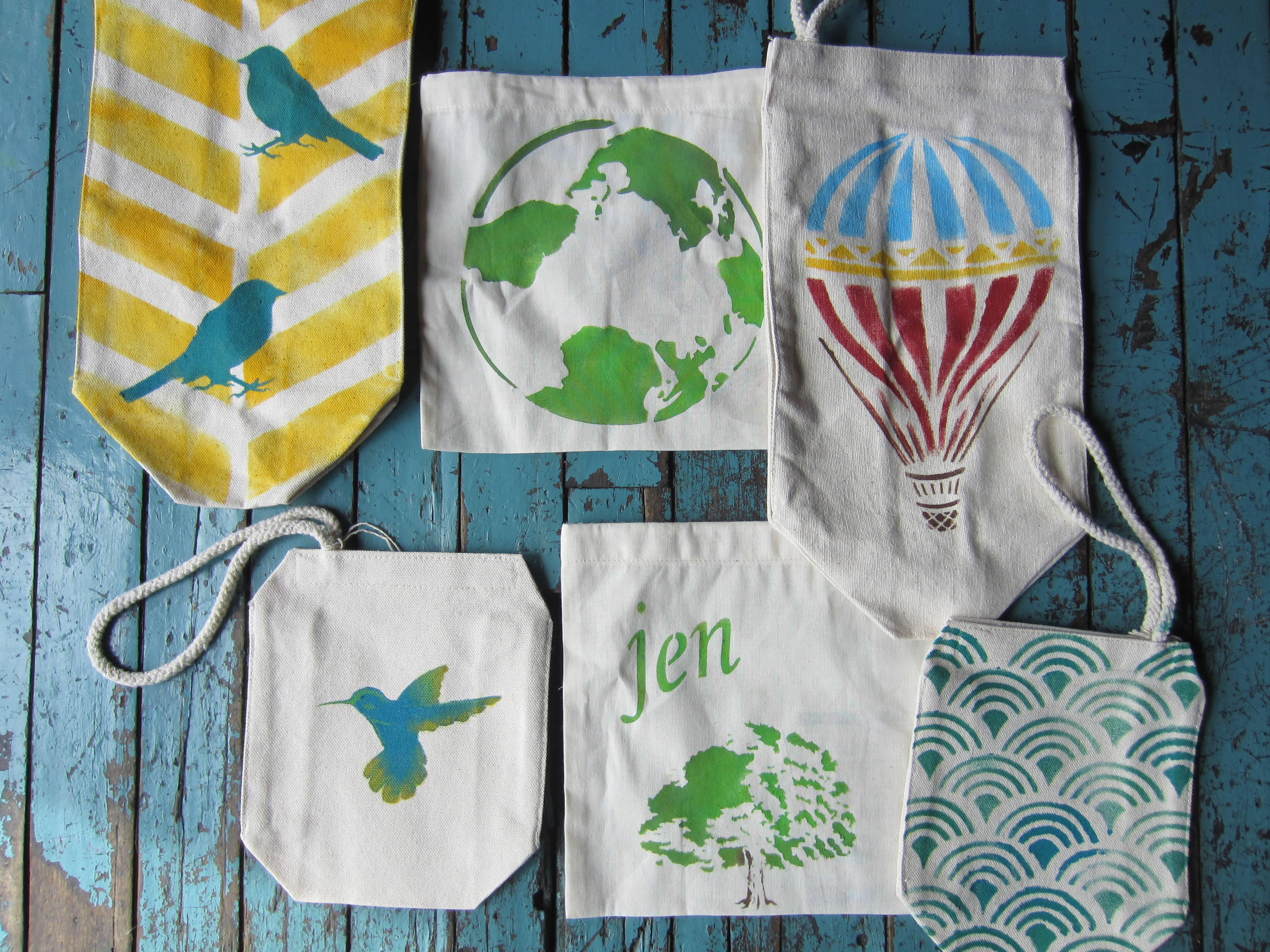 To make these lunch bags you’ll need stencil brushes, stencils and multi-purpose paints. These are the stencils we use: