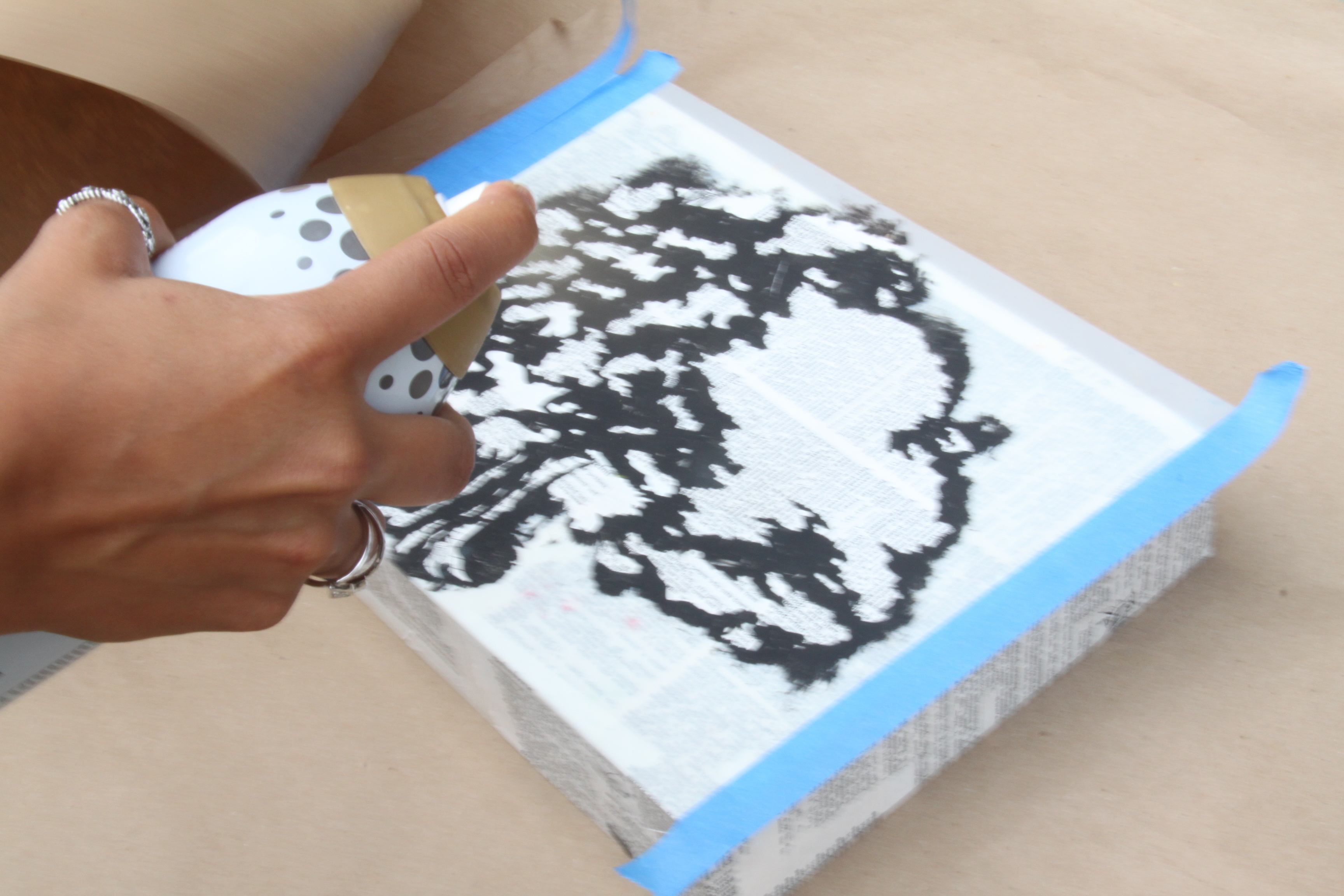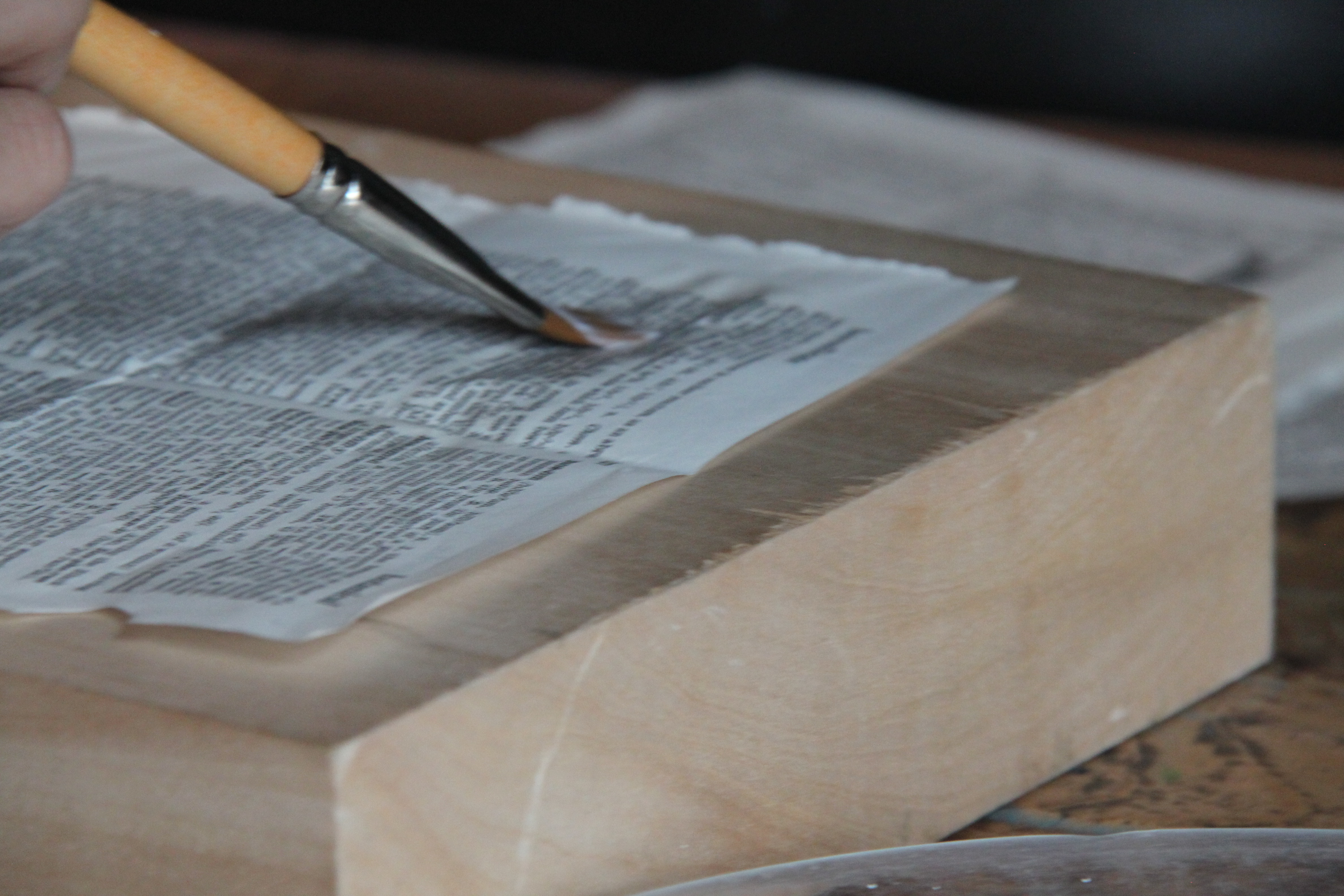 Step 3: With a brush, apply a thin layer onto the back of the paper. Cover the entire surface and then place it on the block with the decoupaged side down. Once it is placed where you want it, apply another thin layer of binder over the paper.