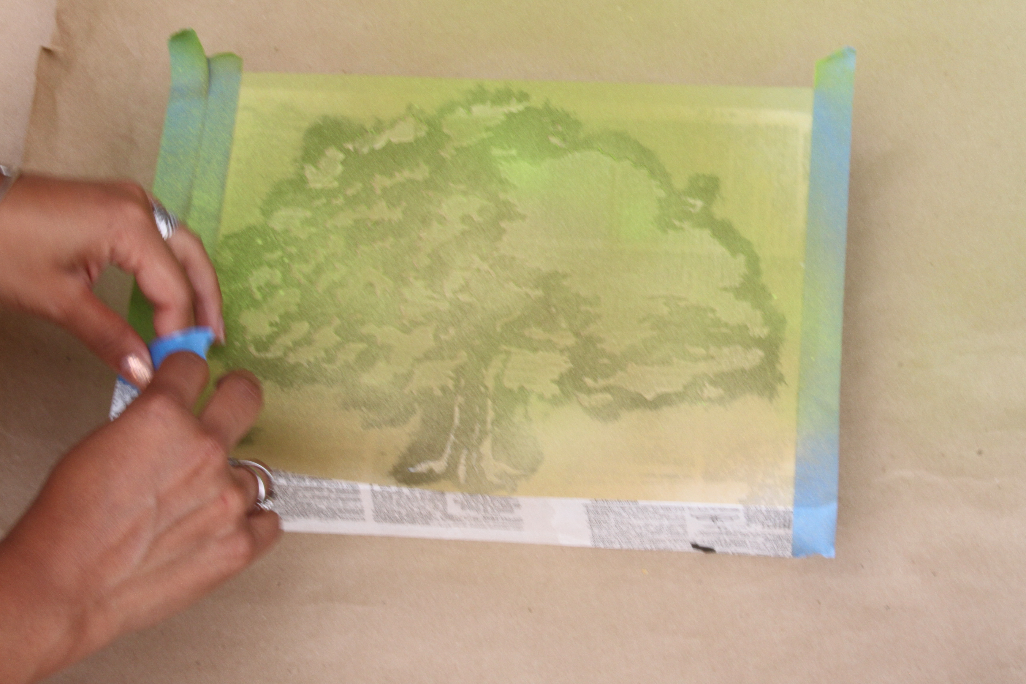Step 5: Spray adhesive on the back of the stencil and place it on the block. Tape the sides of the stencil down to cover exposed paper. Paint the tree with the gold paint first and then apply highlights with the green paint. Carefully remove the stencil and allow the paint to dry. We loved how the addition of the green created a moss-like effect!