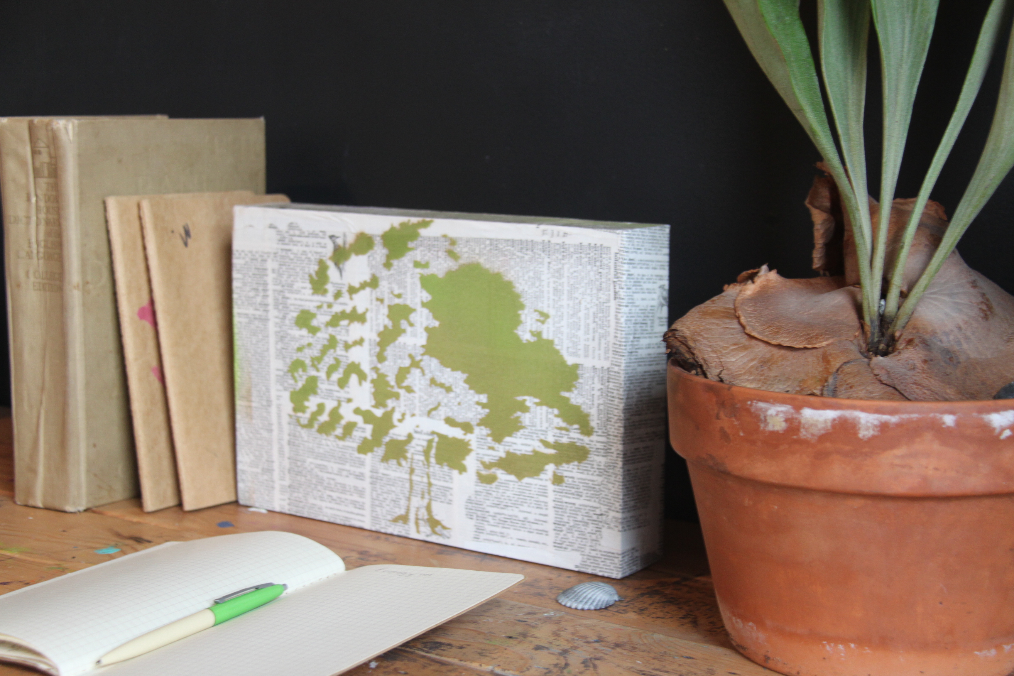 This is what you’ll need: A wooden block, old dictionary or book (use newspaper or magazine pages as an alternative), acrylic binder, two plates, paint brush, Stencil1 Oak Tree stencil, Cleveland Grey and First Place Metallic Plutonium aerosol paint, spray adhesive and painters tape.