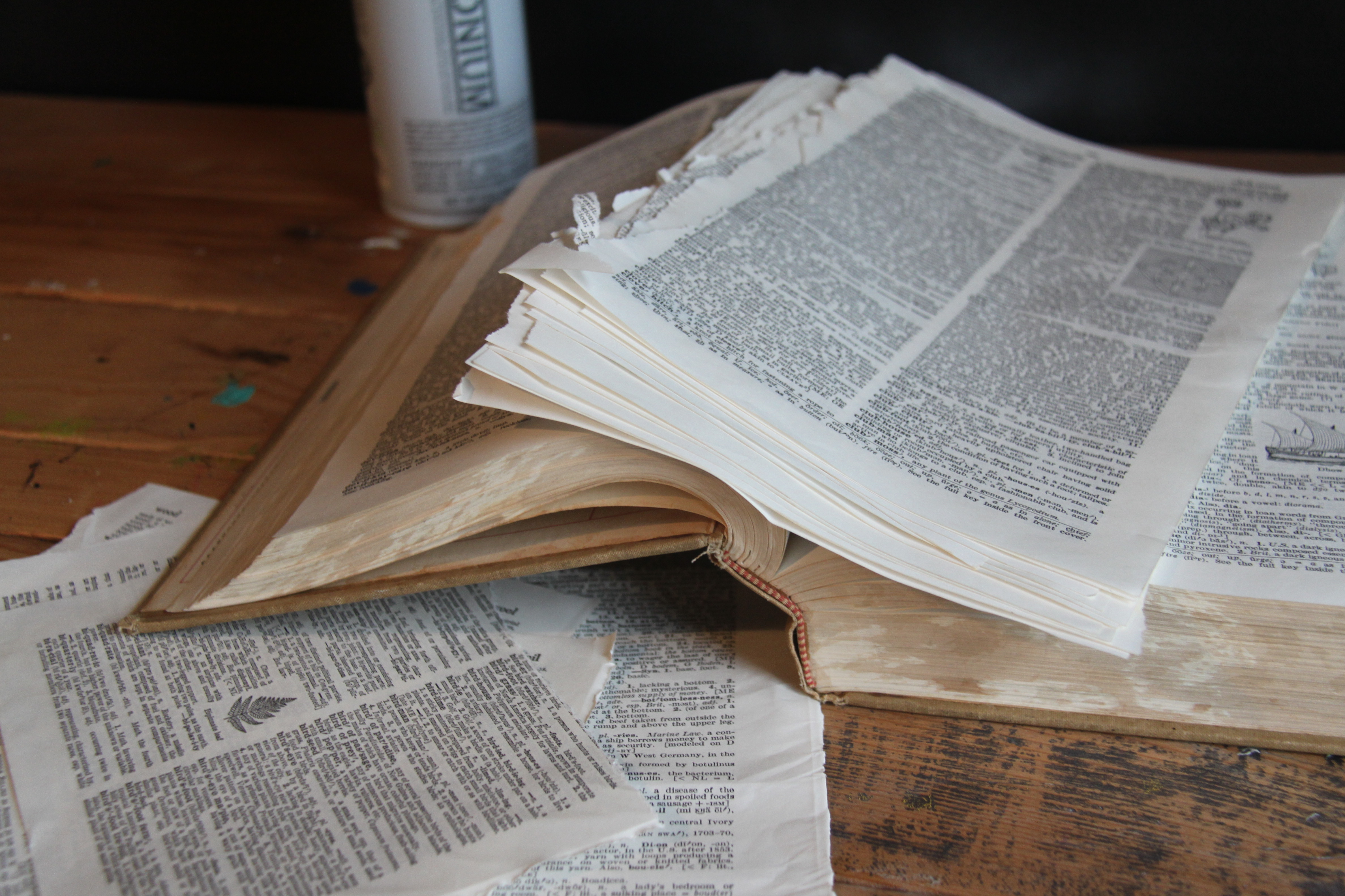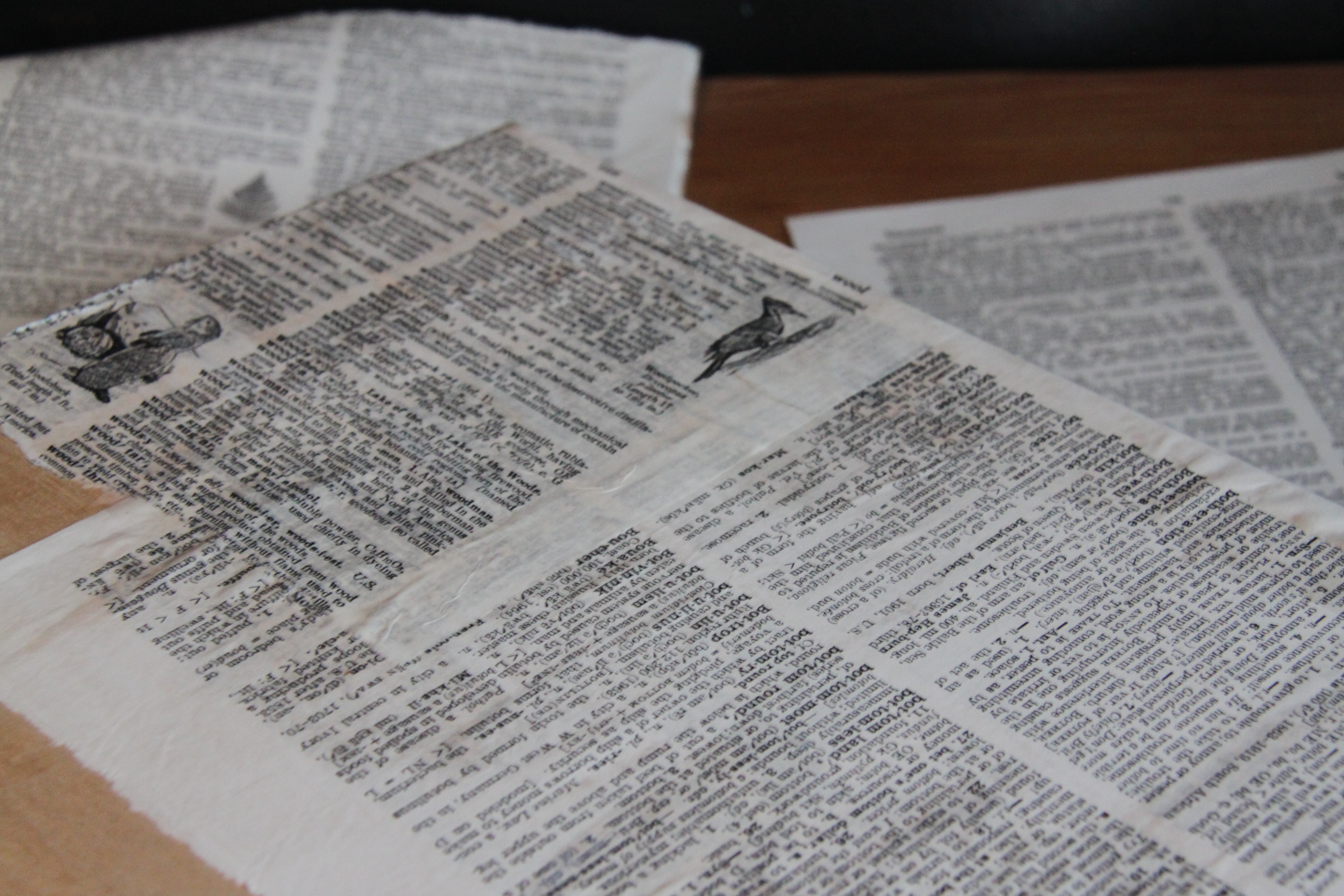 Step one: Look thorough your dictionary for pages you’d like to decoupage to the wooden block. We searched for pages with nature-themed pictures and words. Tear out full pages at first and once you start decoupaging you can trim them.