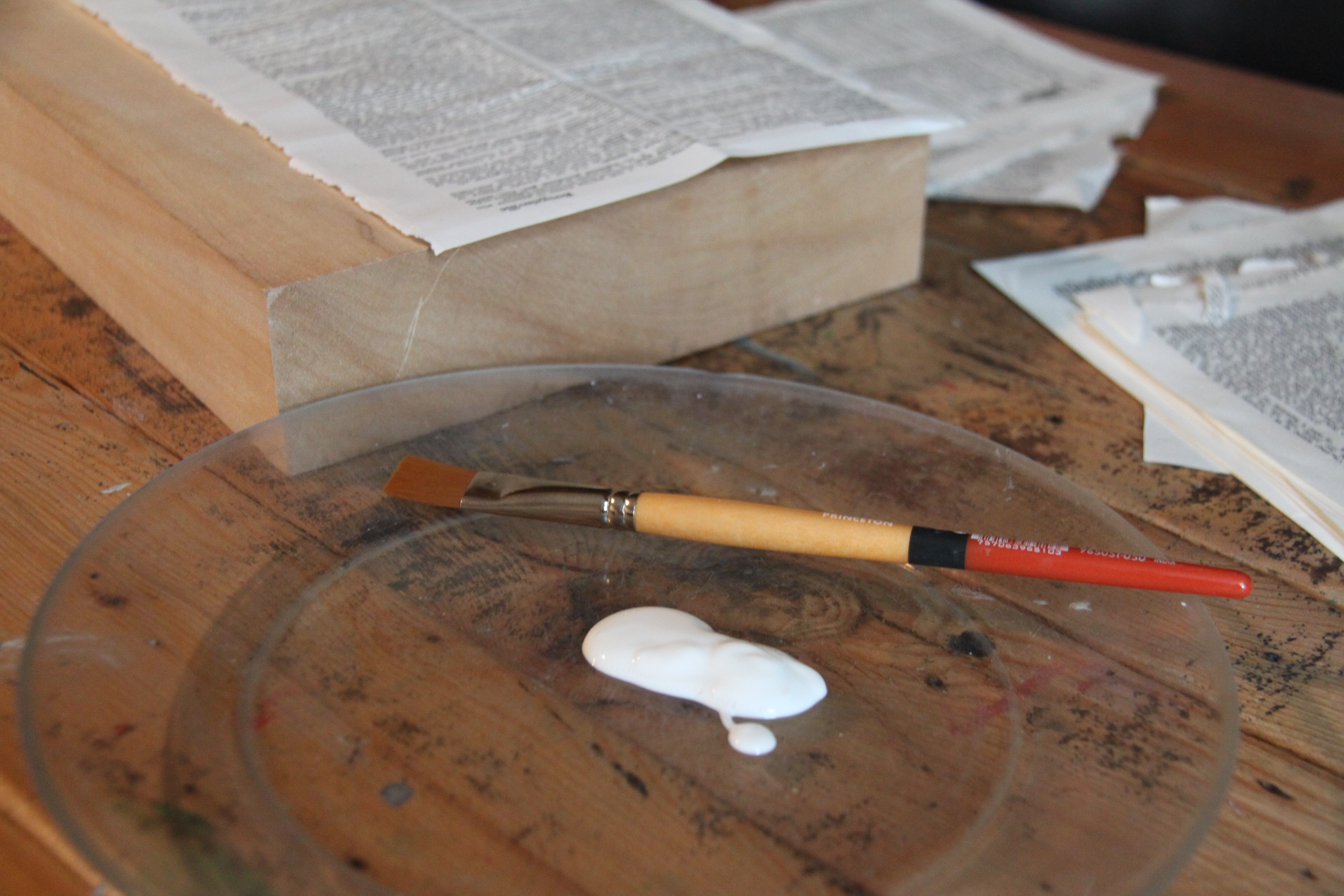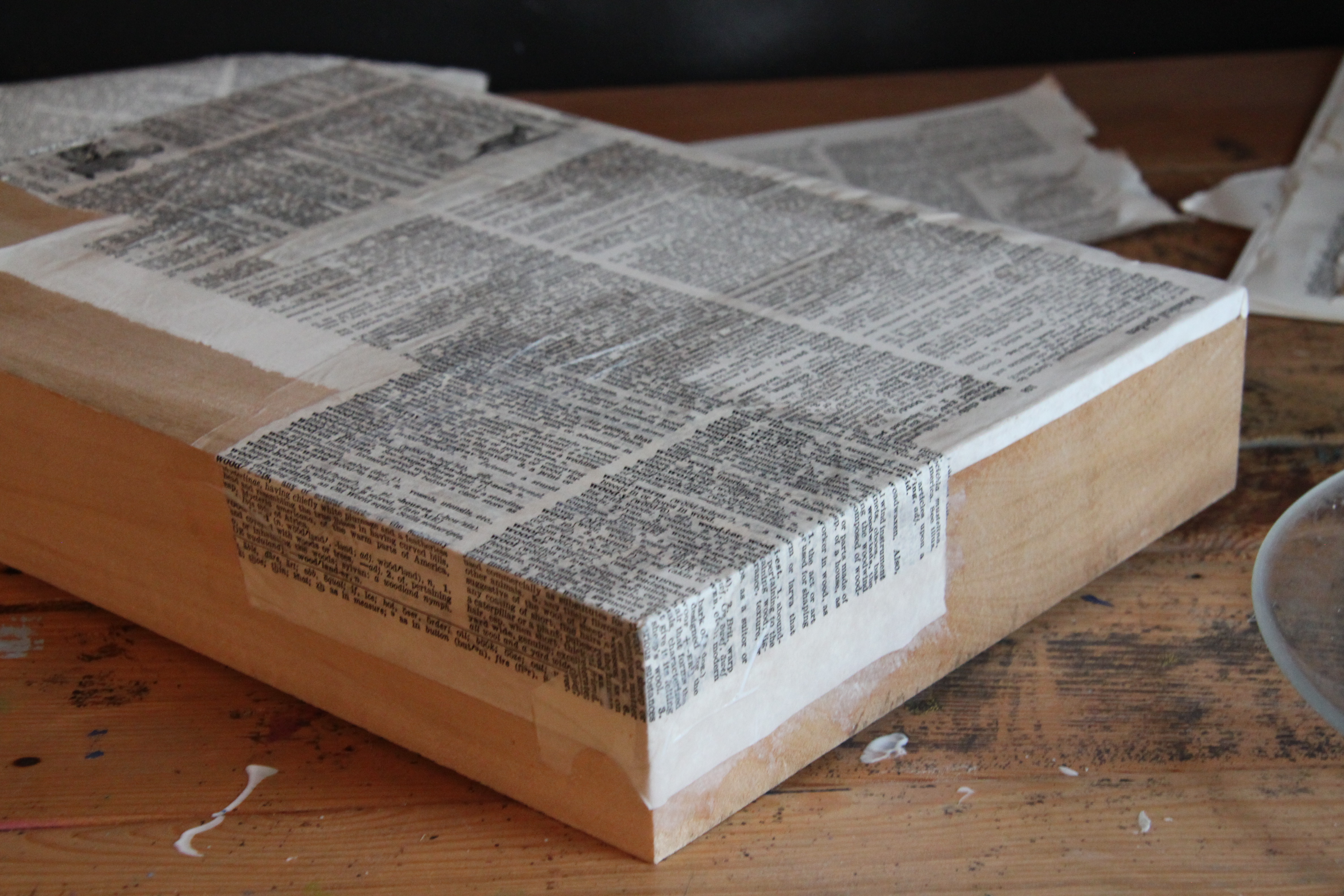 Step two: Start arranging your pages on the wooden block. Play with the placement of the pages so that certain words and images are peeking out. You can also tear pages to create more textured edges. You don’t need to plan out the entire block, just a section to get you started. Pour some binder on one plate. Use the other plate as a surface to apply the decoupage.