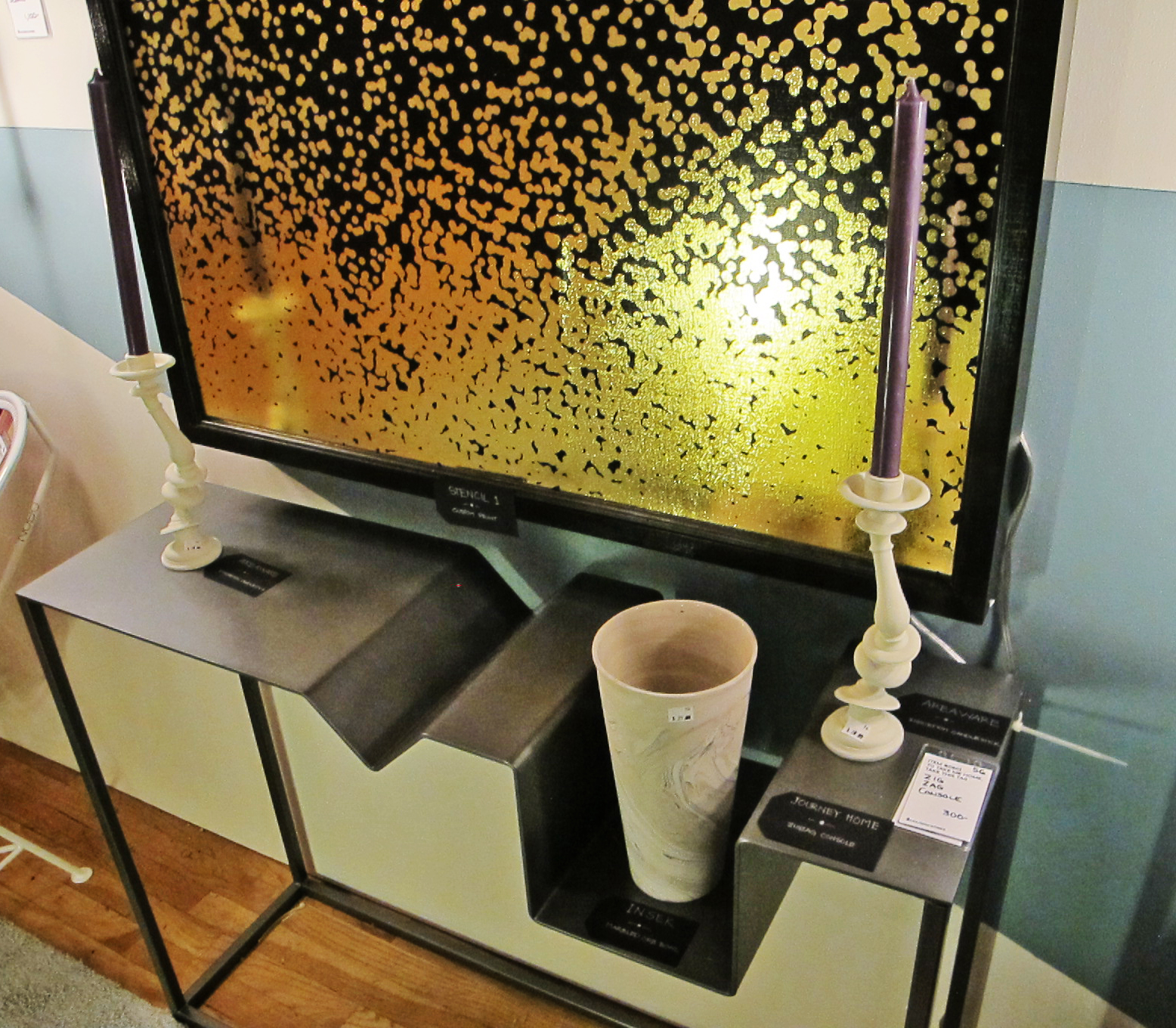 I recently designed and donated a print to be sold at a Housing Works event DESIGN ON A DIME. The inspiration was champagne bubbles and was printed on gold metallic paper with a black ink.
