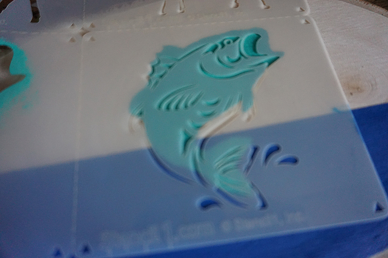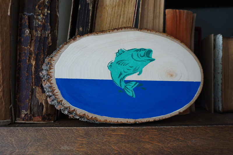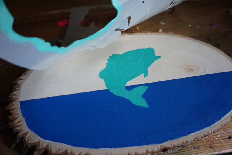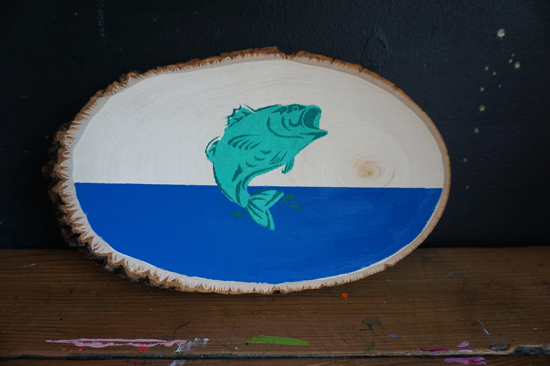 Once your water area is dry, you can paint the silhouette of the Bass Fish. Place it so it’s coming out of the water.