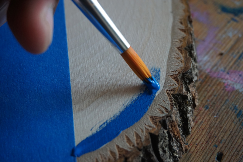 Use a pointed smaller brush and paint the edge to keep the rough wood exposed.