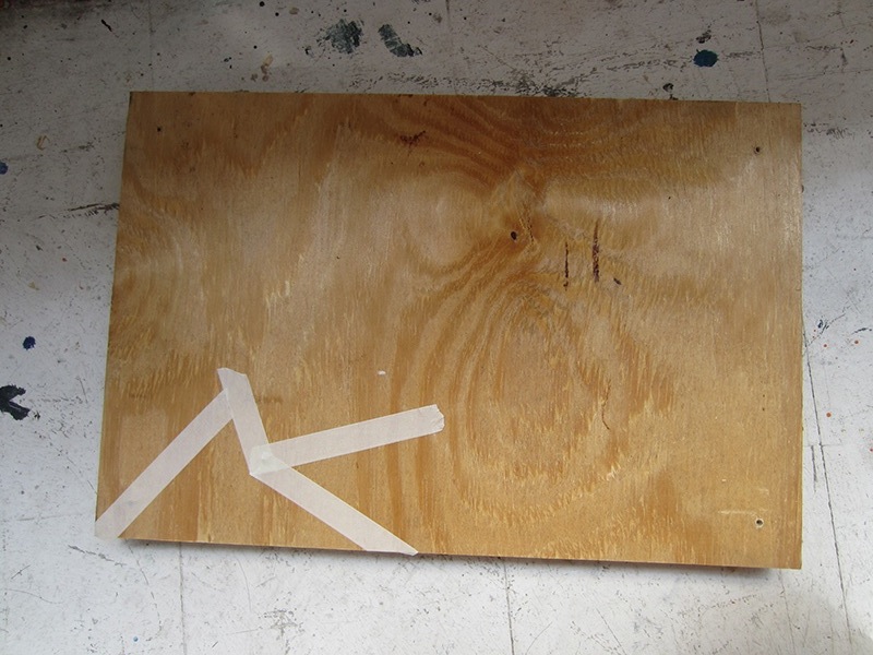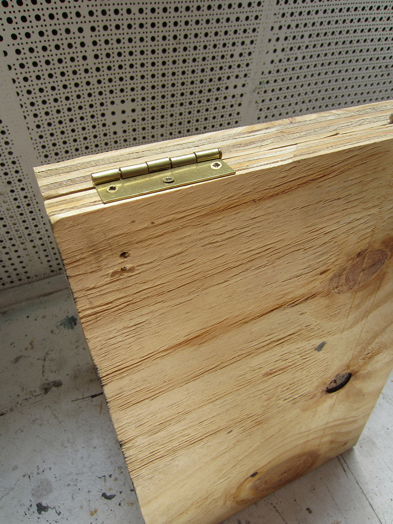 Start with a wooden stand (you can make this by using metal hinges, found at any hardware store, to attach two pieces of plywood or any wood you can find), brass hooks and tape.