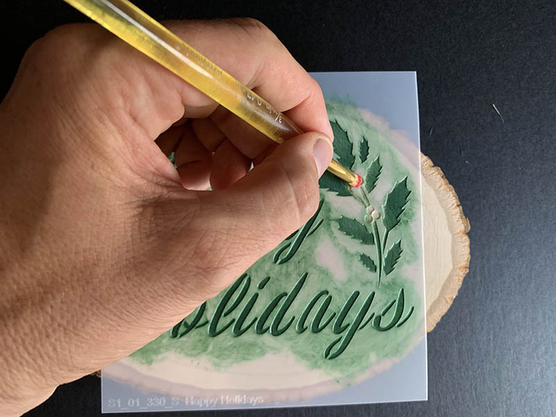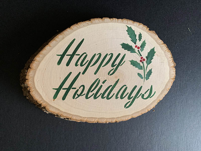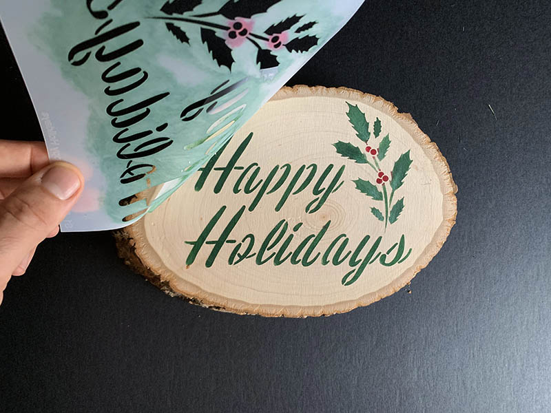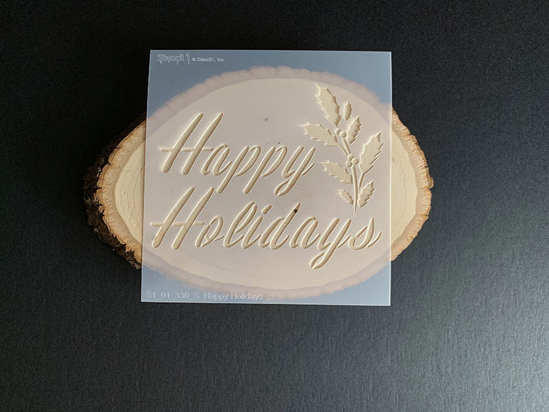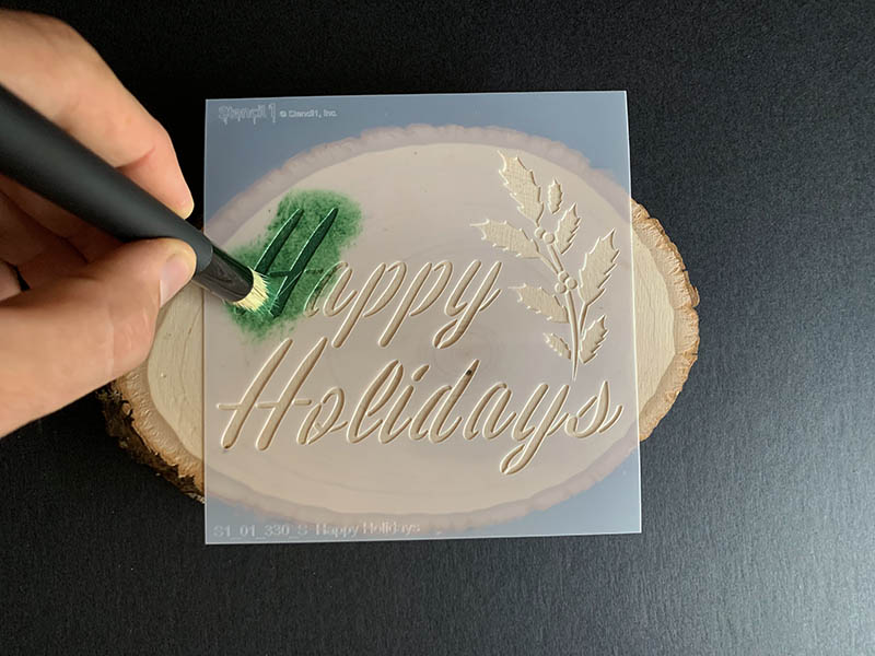 What you will need for this project: green and red acrylic paints, a wood slab, stencil brushes in 2 sizes and the Happy Holidays stencil. The wood slab can be found at any craft store. You can also use low tack adhesive spray to secure the stencil in place.
