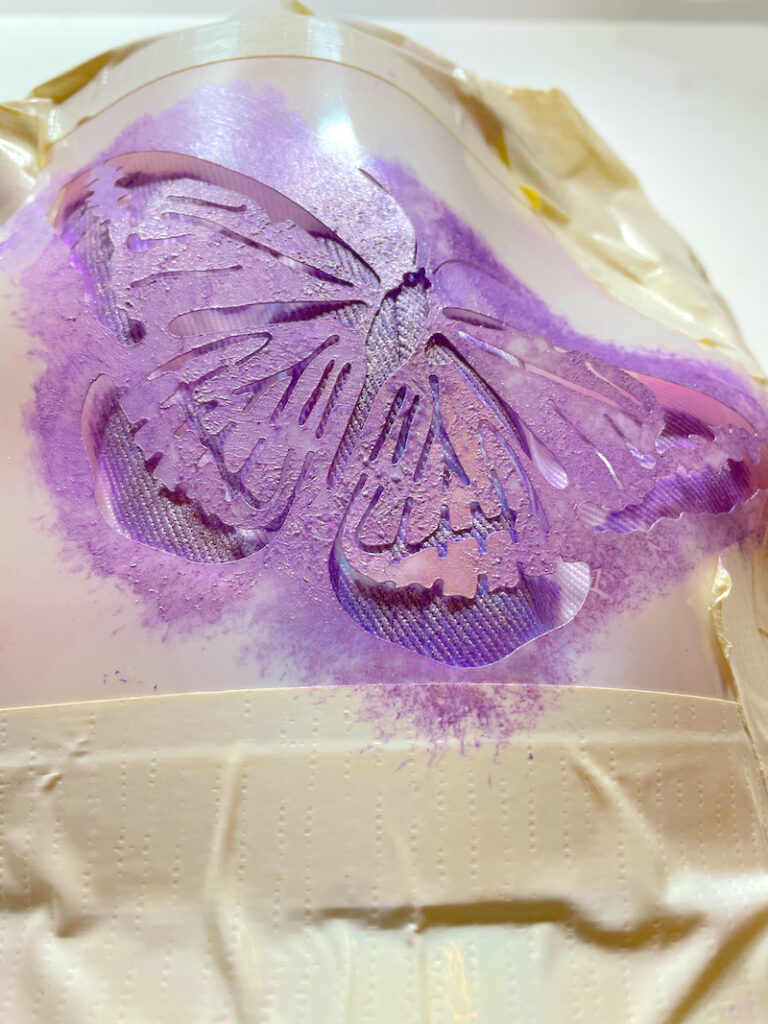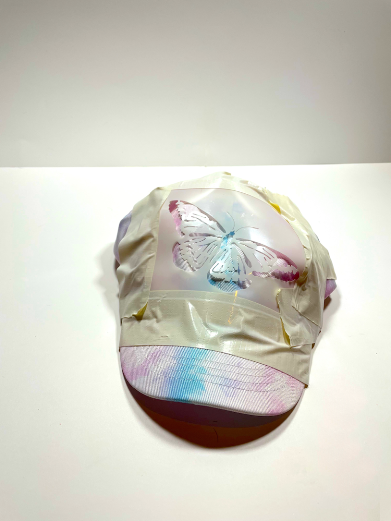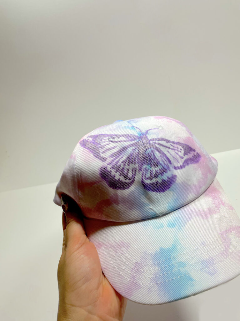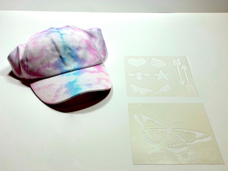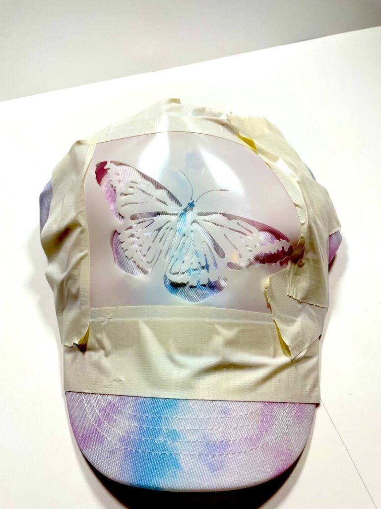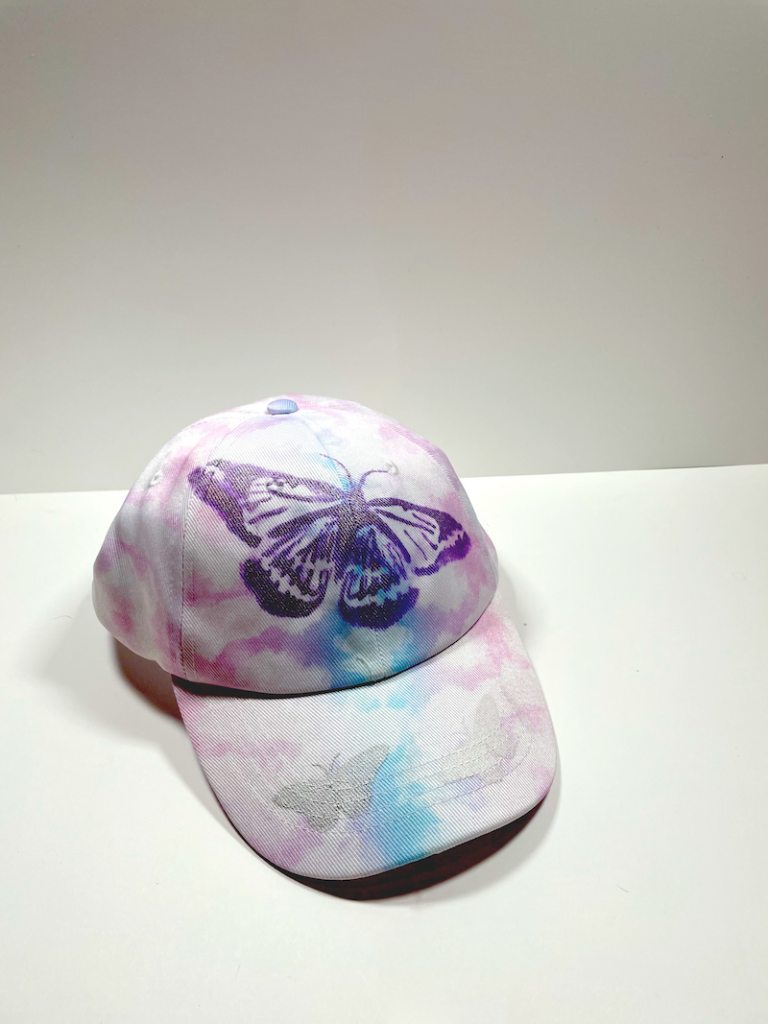 Step 1: Pick Your Hat! This hat was found in a dollar store. The hat, although beautiful, felt like it was missing a symbol or emblem in the front. Using the Butterfly Stencil, and Pearlescent medium mixed with Titanium White, Silver fabric paint, and purple pearlescent fabric paint were used on three of the butterflies.
