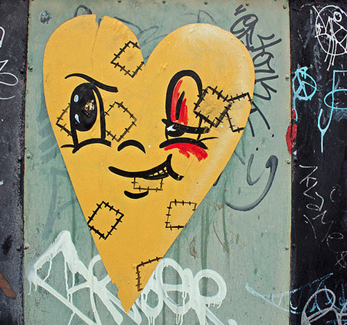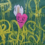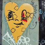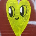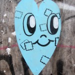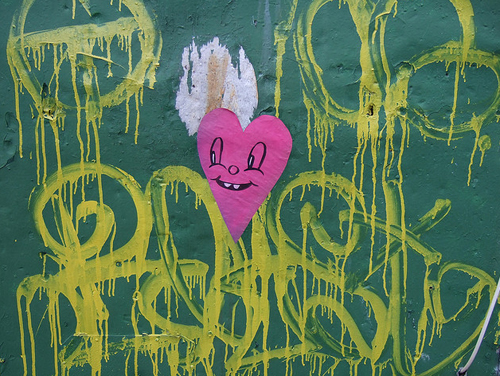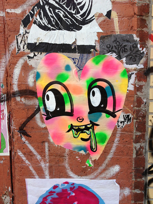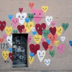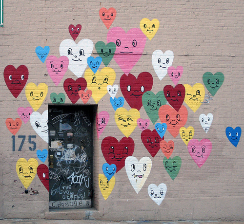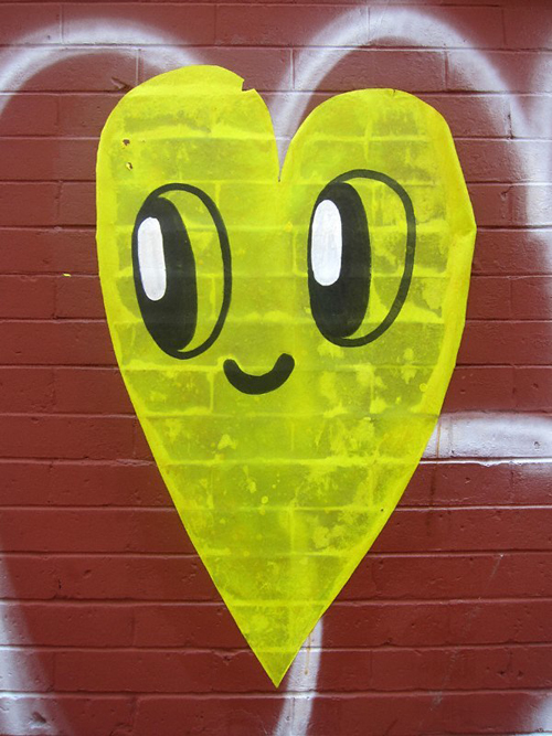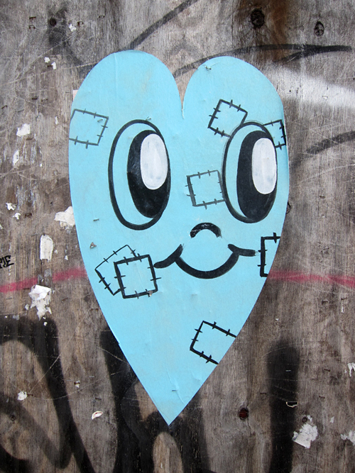 For several years I  have seen these happy faced hearts wheat-pasted all over my neighborhood in Brooklyn. Popping out of graffiti covered doors or on decayed walls, they add fun to the urban landscape and often a smile to my face.