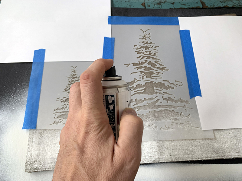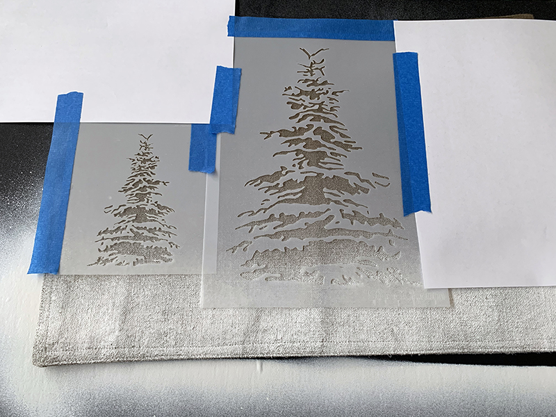 Secure the pine tree stencil with masking tape. You can use low tack spray adhesive to hold the stencil down when spraying as well to get all the stencil design details.