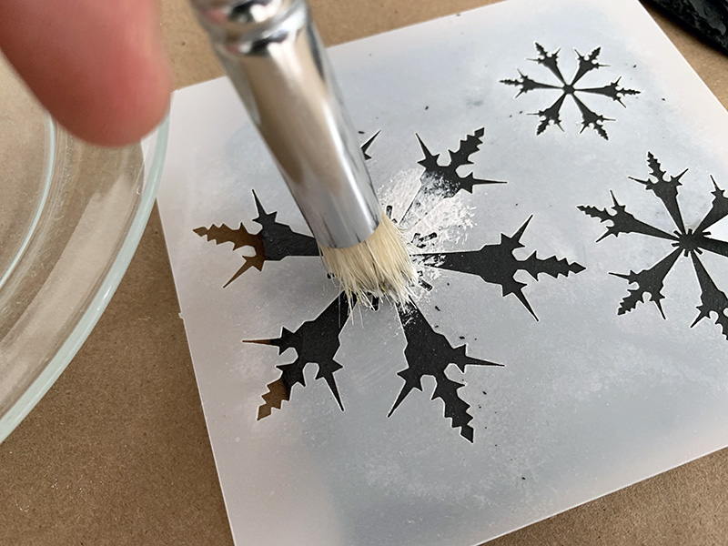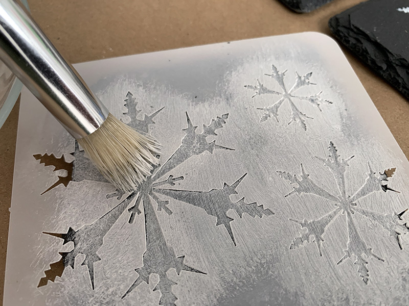 I recommend using an adhesive spray to secure the stencil before you start painting. With a tapping motion, begin painting the stencil on the coaster.