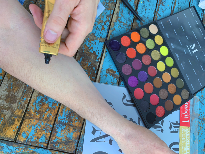 Place the stencil and fill in with body makeup, this one is a creme that is water activated. I used a cosmetic sponge to apply it. Dab it on and build up layers. Doing your face will be easier than how I am doing it here as you can hold it in place with one hand, apply the makeup with the other. My arm being the canvas didn’t allow it to be free to use!